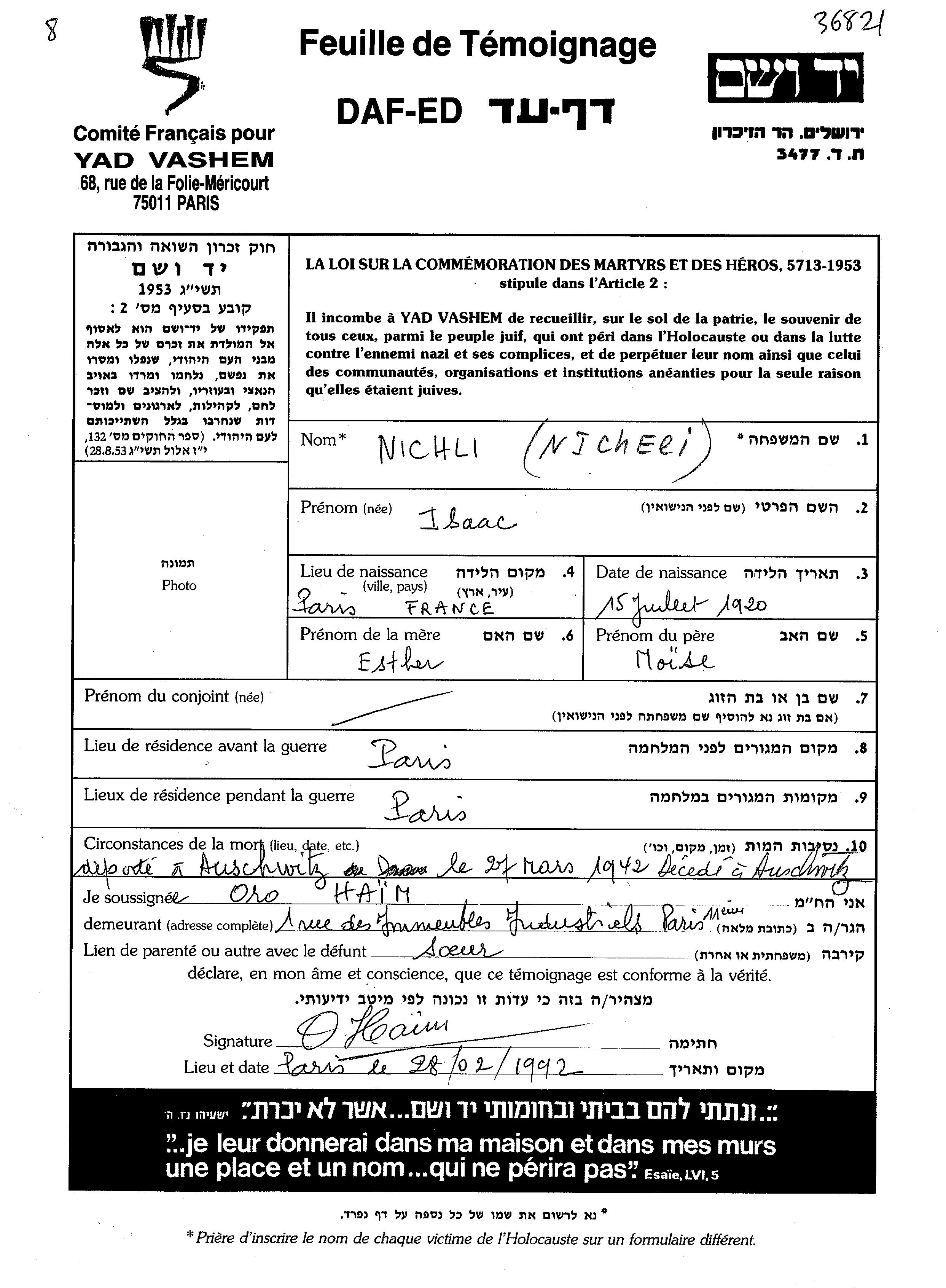 Nicheli Isaak 1920 Paris, Frankreich Liste von Deportierten aus Frankreich
