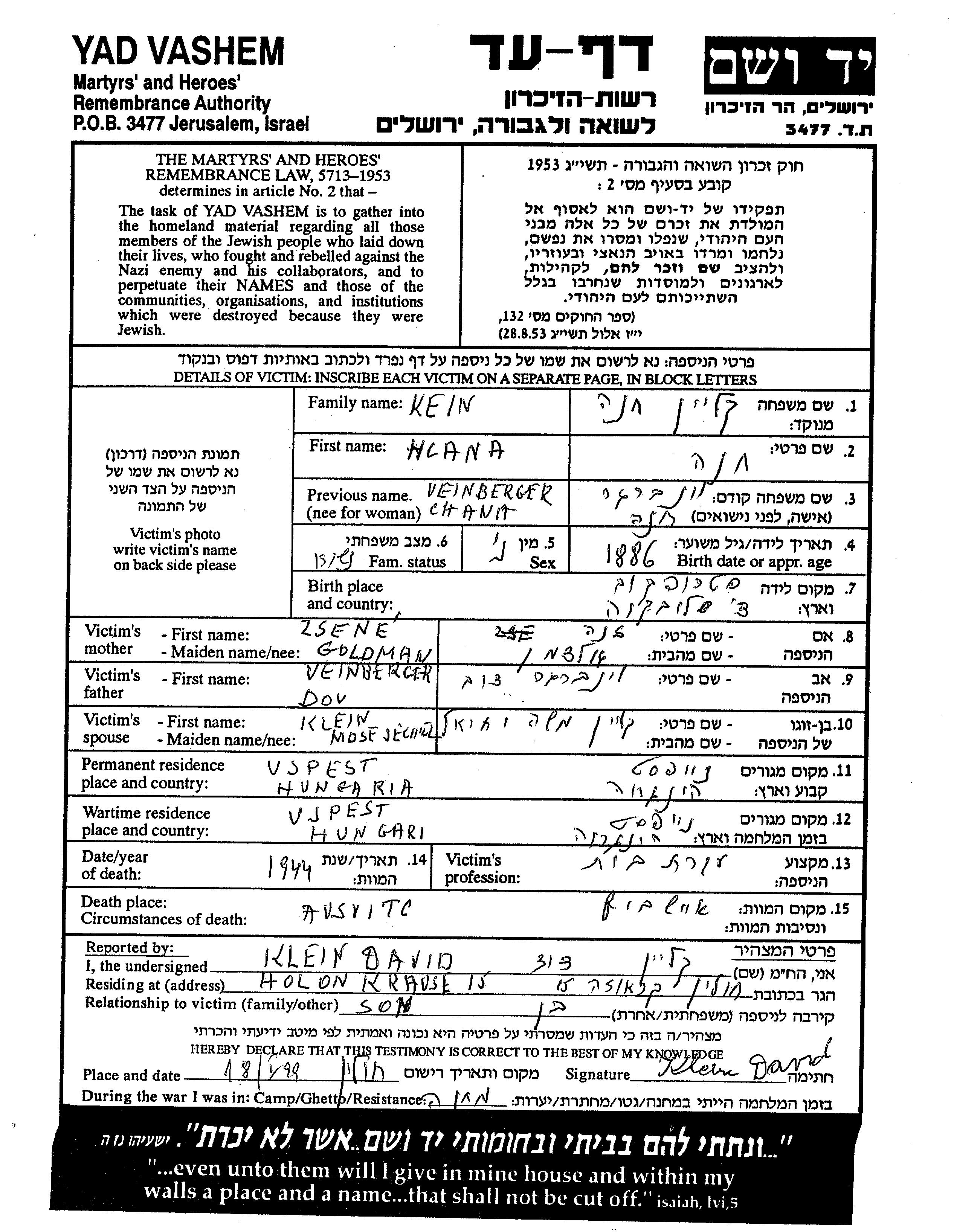 Anna Khana Klein, geb. Veinberger wurde im Jahr 1886 in Stropkov, Tschechoslowakei geboren. Sie war Hausfrau. Vor dem Zweiten Weltkrieg lebte sie in Ujpest, Ungarn.