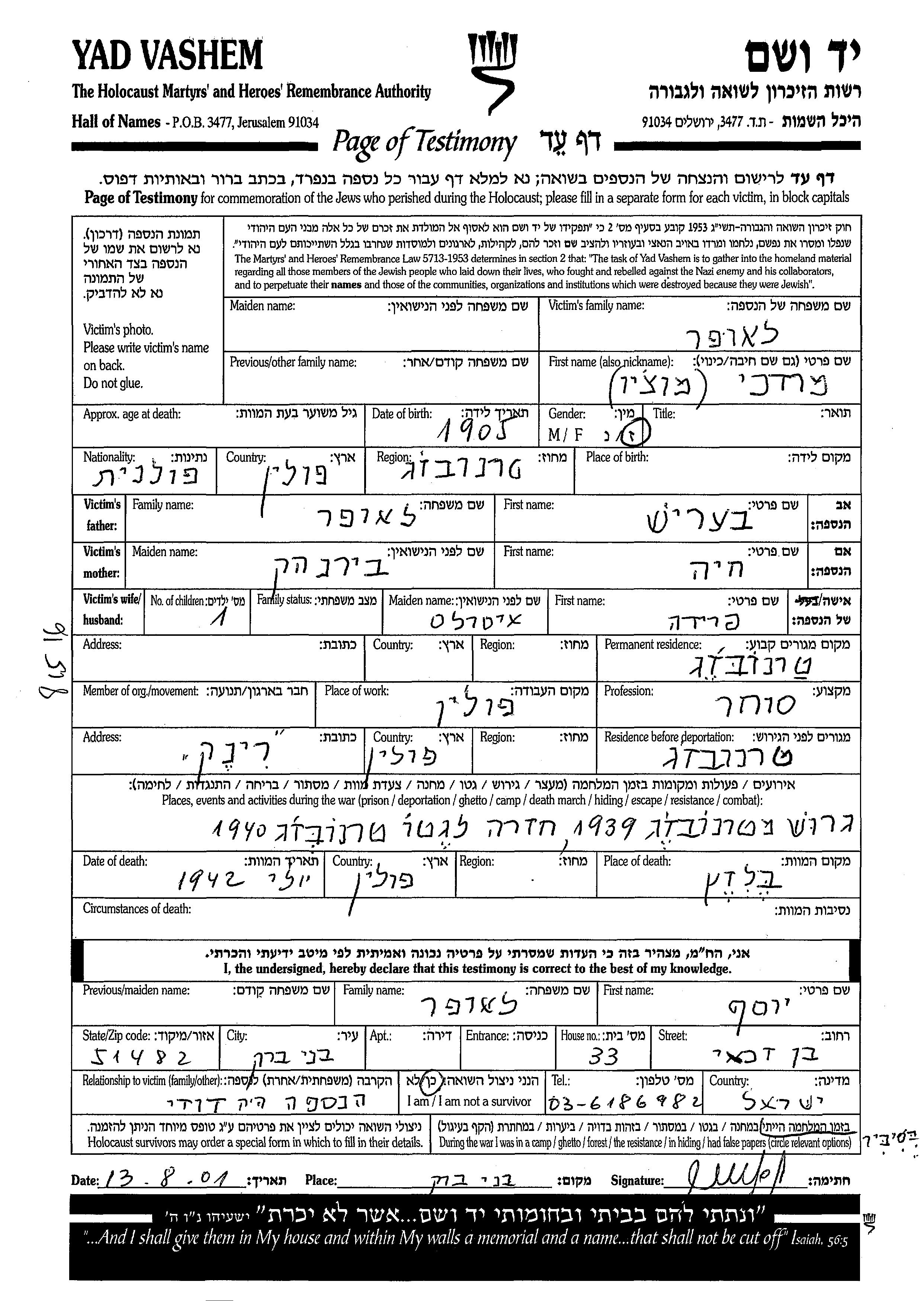 Laufer Mordechai Tarnobzek, Polen Gedenkblatt