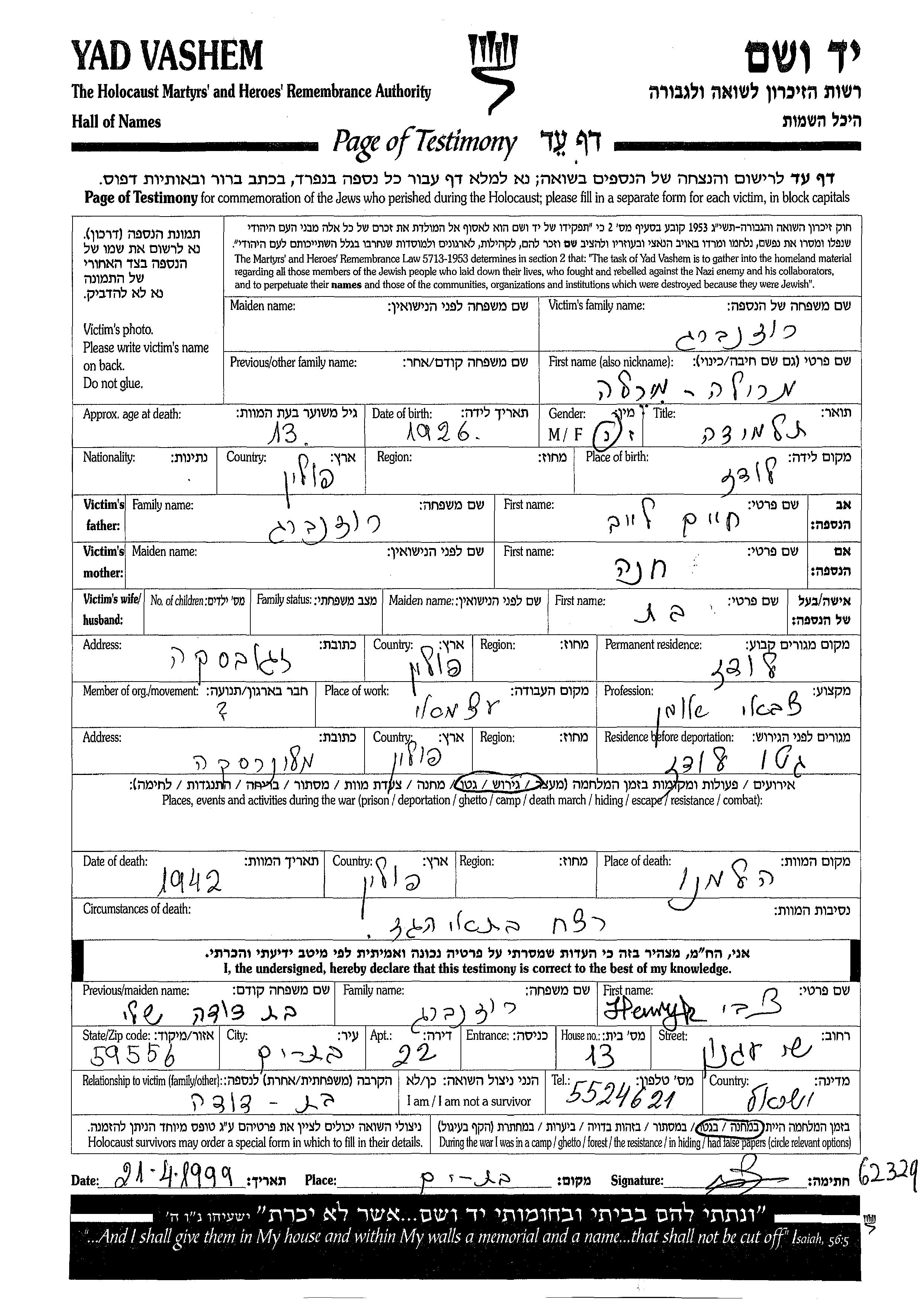 Marila wurde in der Schoah ermordet. Todesort: Chelmno, Polen im Jahr 1942.