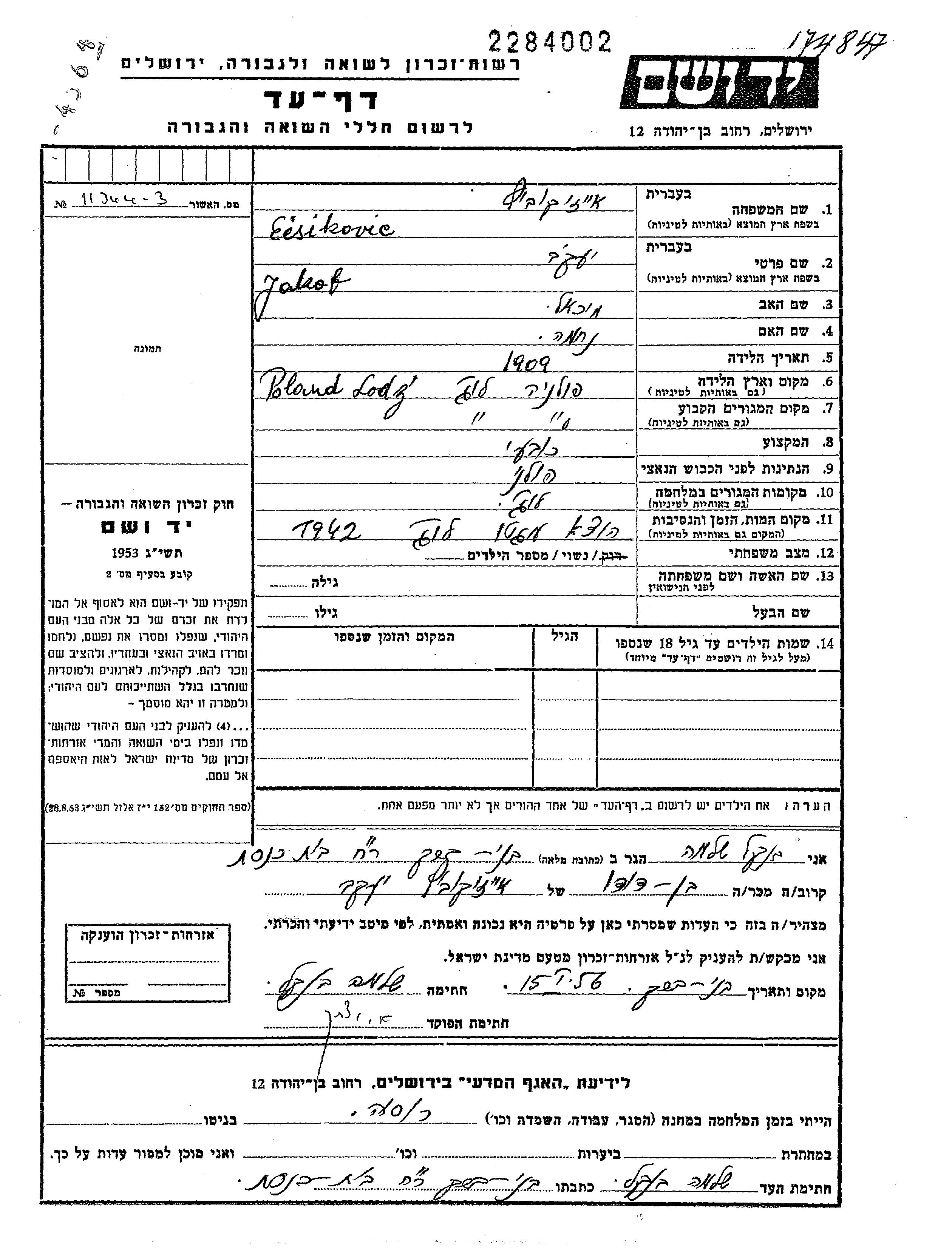 Eisikovic Jakob 1909 Lodz, Polen Gedenkblatt