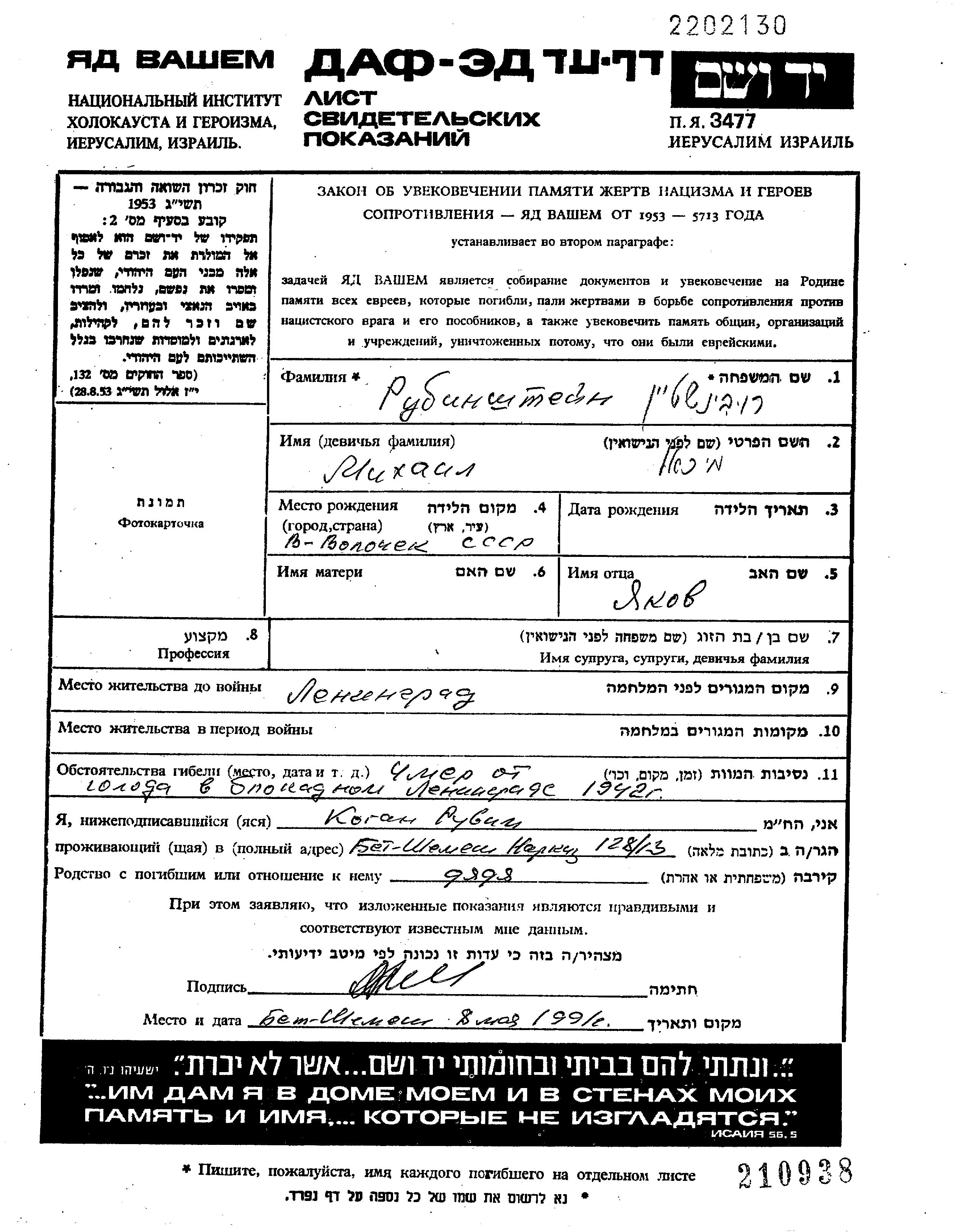 Mikhail Rubinshtein wurde in Vyshniy Volochek, Russland (UdSSR) geboren. Er war Buchhalter/-in. Vor dem Zweiten Weltkrieg lebte er in Leningrad, Russland (UdSSR).