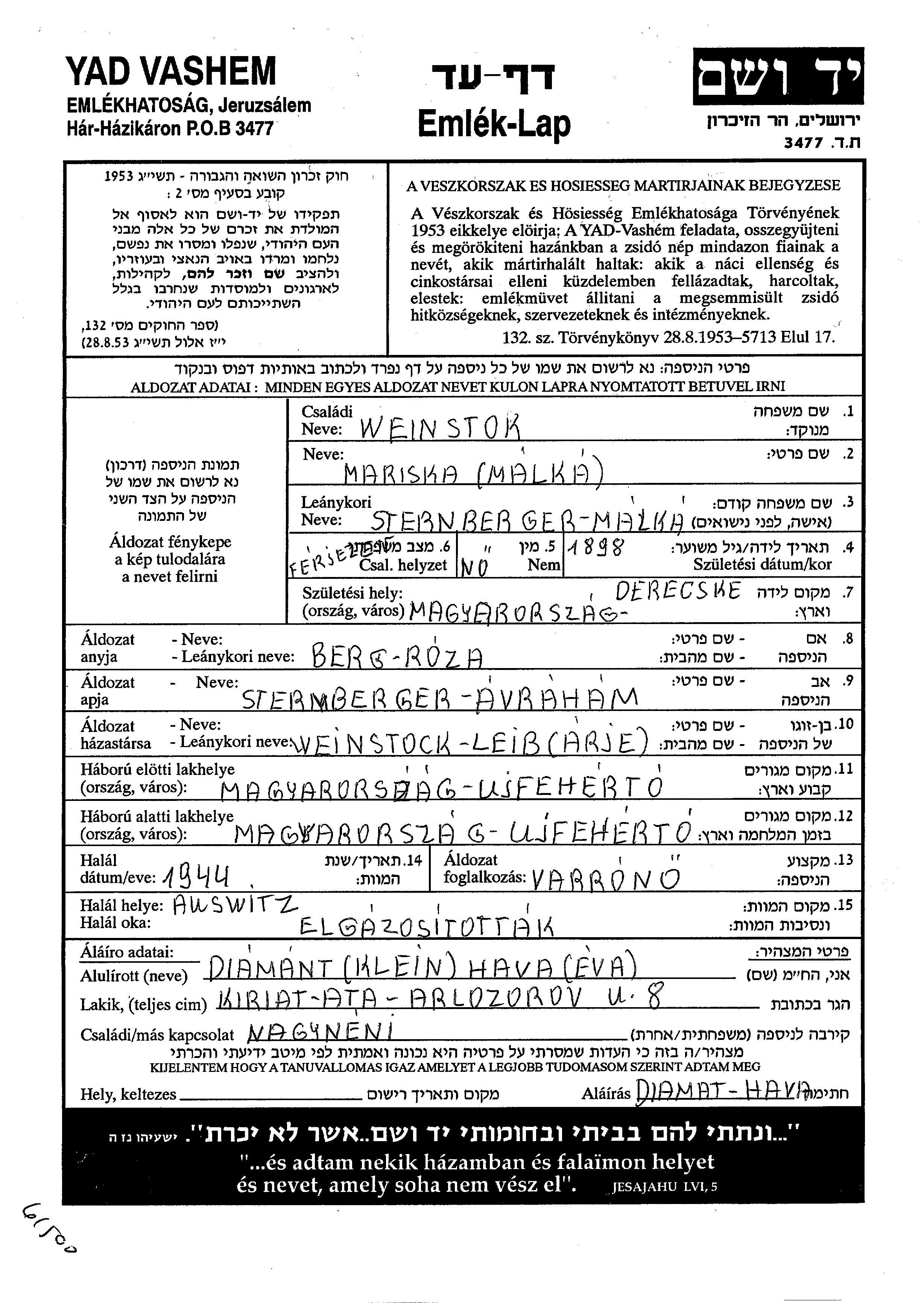 Mariska Malka Veinshtok, geb. Sternberger דערעטשקער wurde im Jahr 1898 in Derecske, Ungarn geboren. Sie war Schneiderin. Vor dem Zweiten Weltkrieg lebte sie in Ujfeherto, Ungarn.
