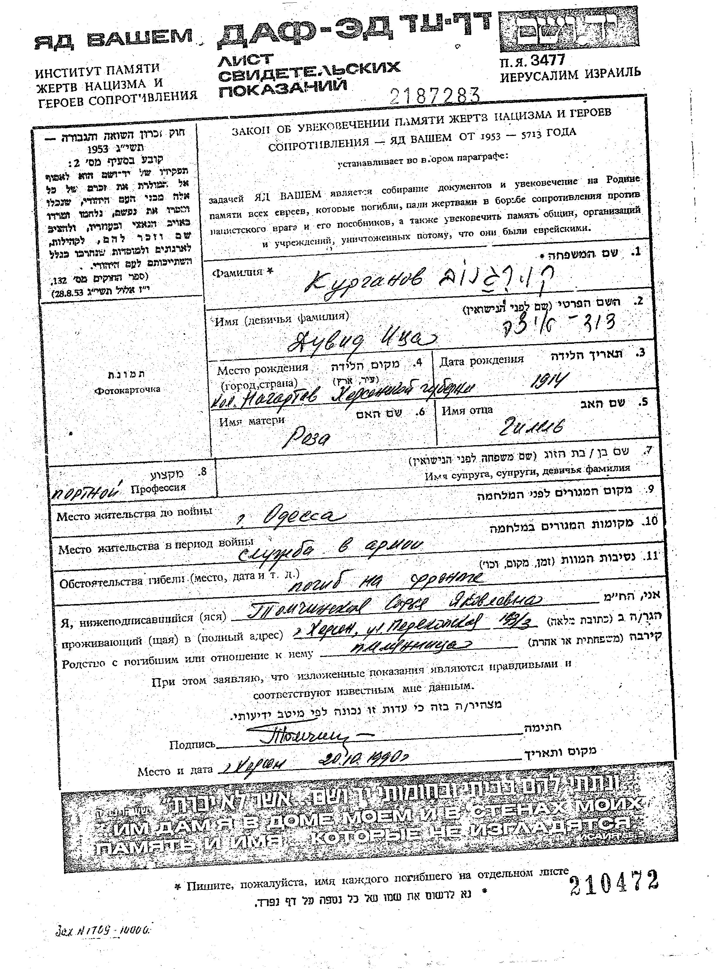 Kurganov David Yitzkhak 1914 Odessa, Ukraine (UdSSR) Gedenkblatt