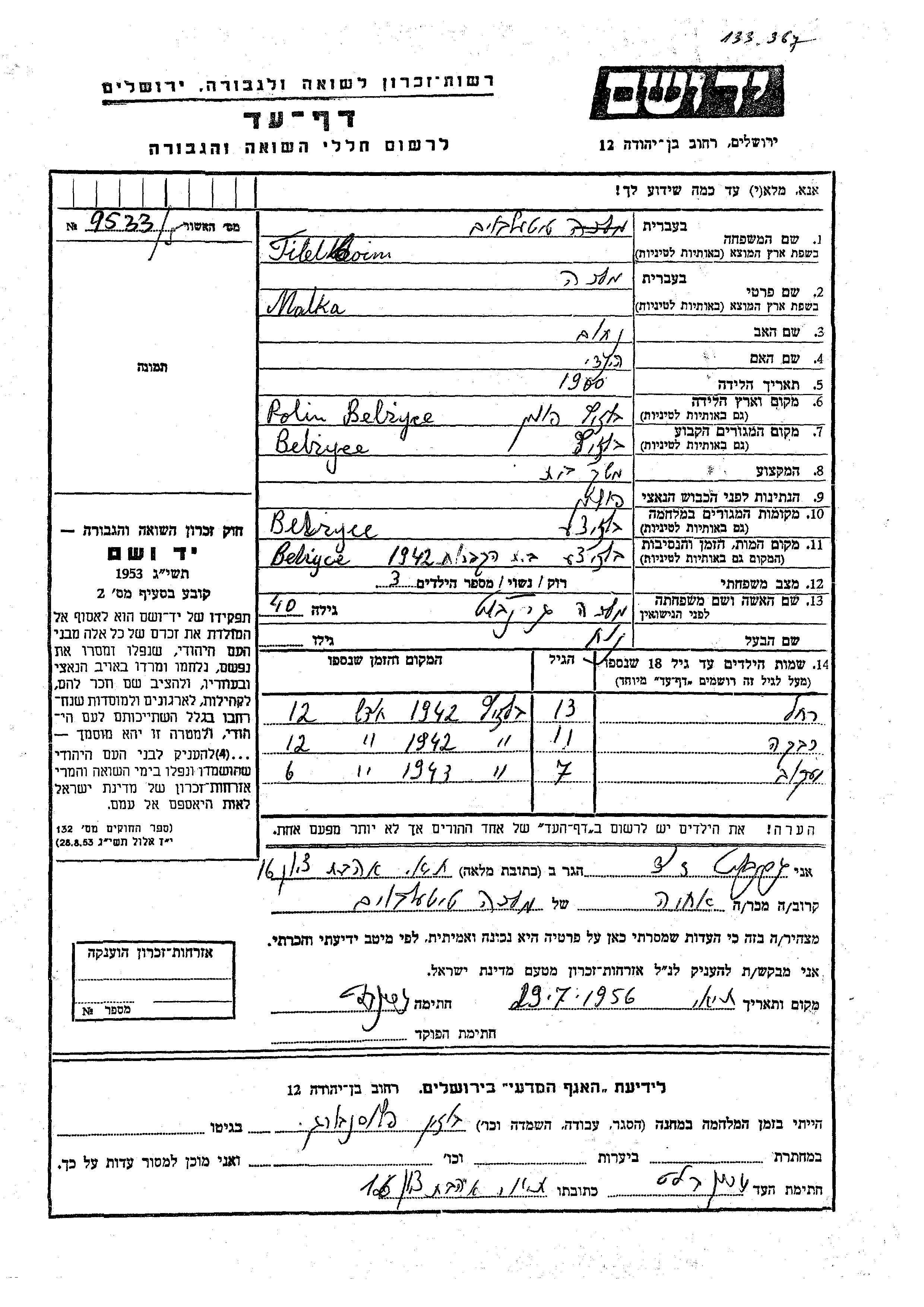 Yaakov Titelboim. Vor dem Zweiten Weltkrieg lebte er in Belzyce, Polen.