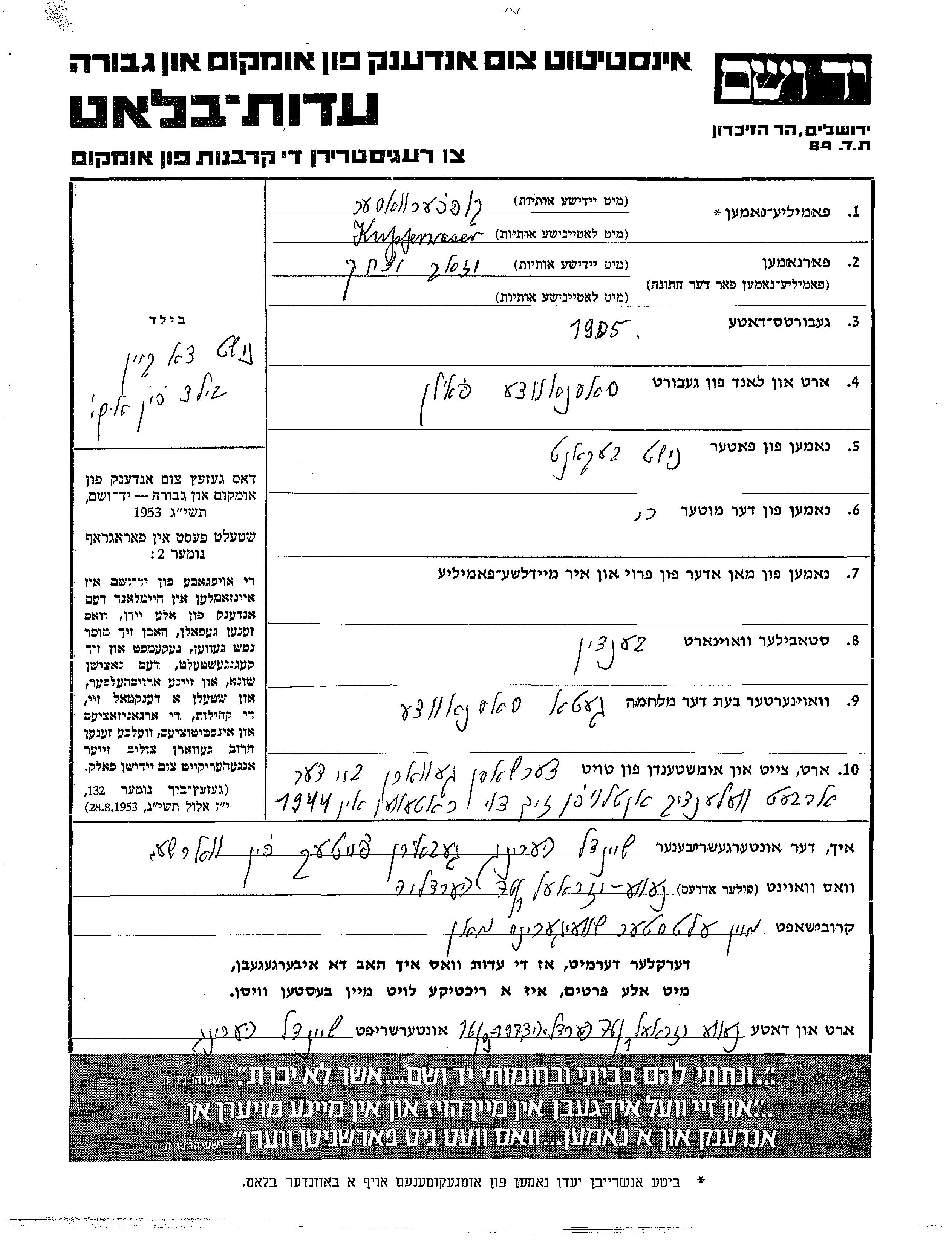 | Kupperwaser | Yitzkhak | 1905 | Bendin, Polen | Gedenkblatt |