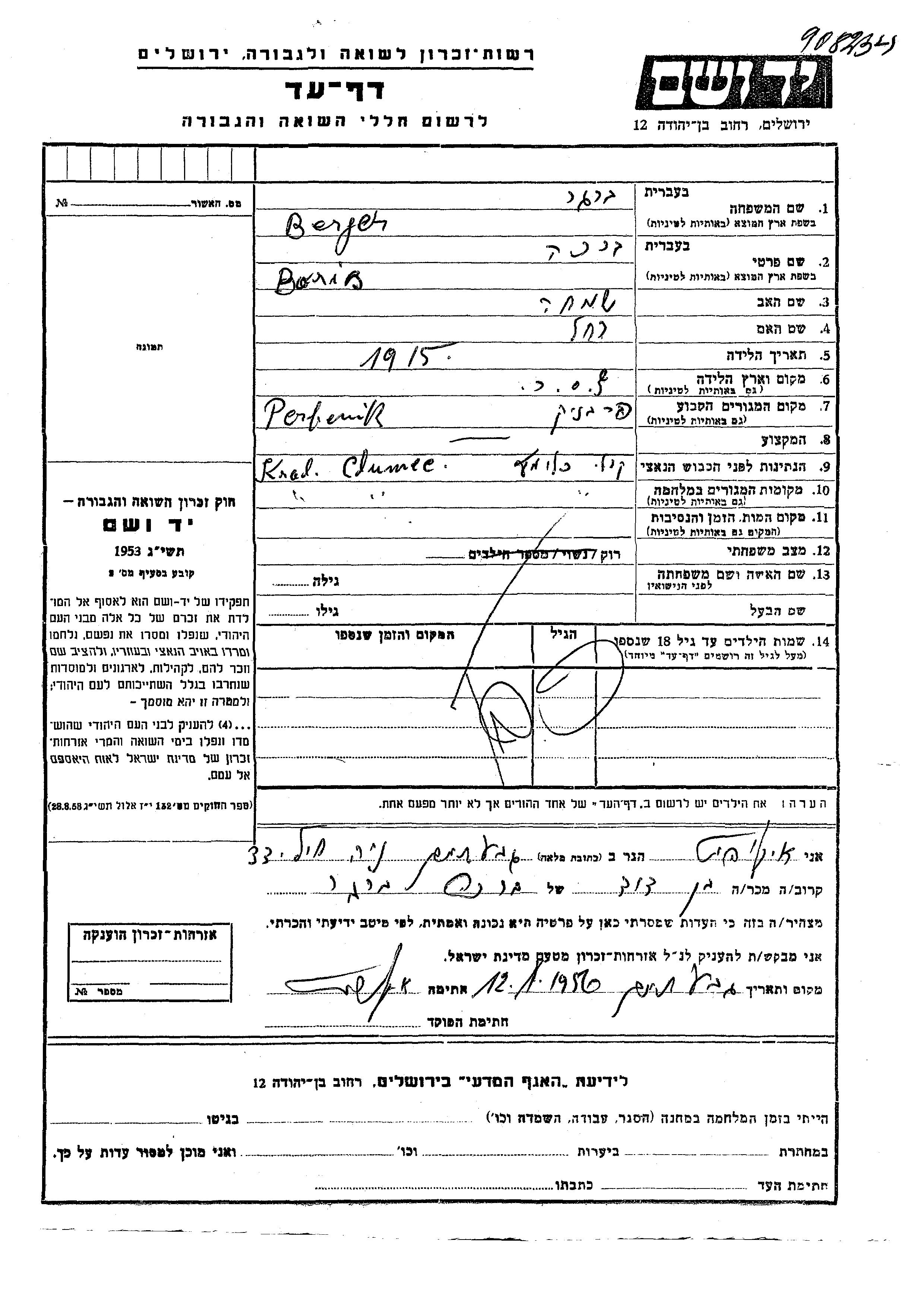 Boris Brakha Berger wurde im Jahr 1915 in Tschechoslowakei geboren. Er war der Sohn von Simkha und Rakhel. Er war Ledig. Vor dem Zweiten Weltkrieg lebte er in Perbenik, Tschechoslowakei. Während des Krieges war er in Kralovsky Chlumec, Tschechoslowakei.