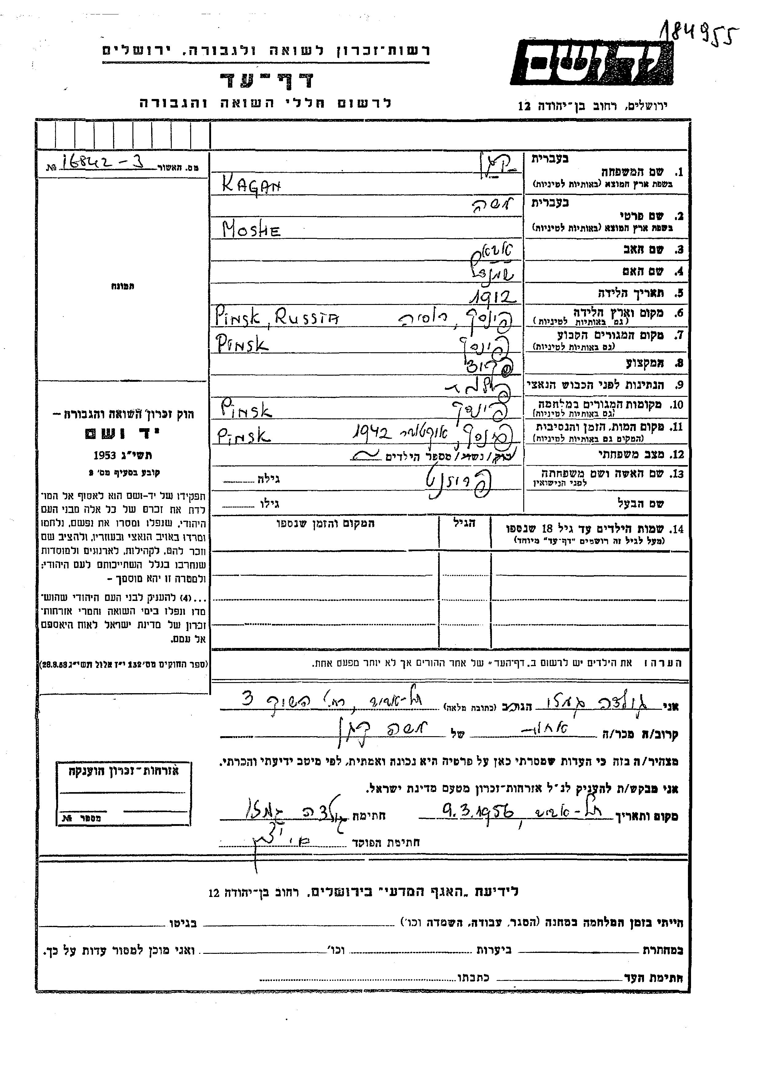 Moshe Kagan wurde im Jahr 1912 in Pinsk, Polen geboren. Er war Angestellte/-r. Vor dem Zweiten Weltkrieg lebte er in Pinsk, Polen.