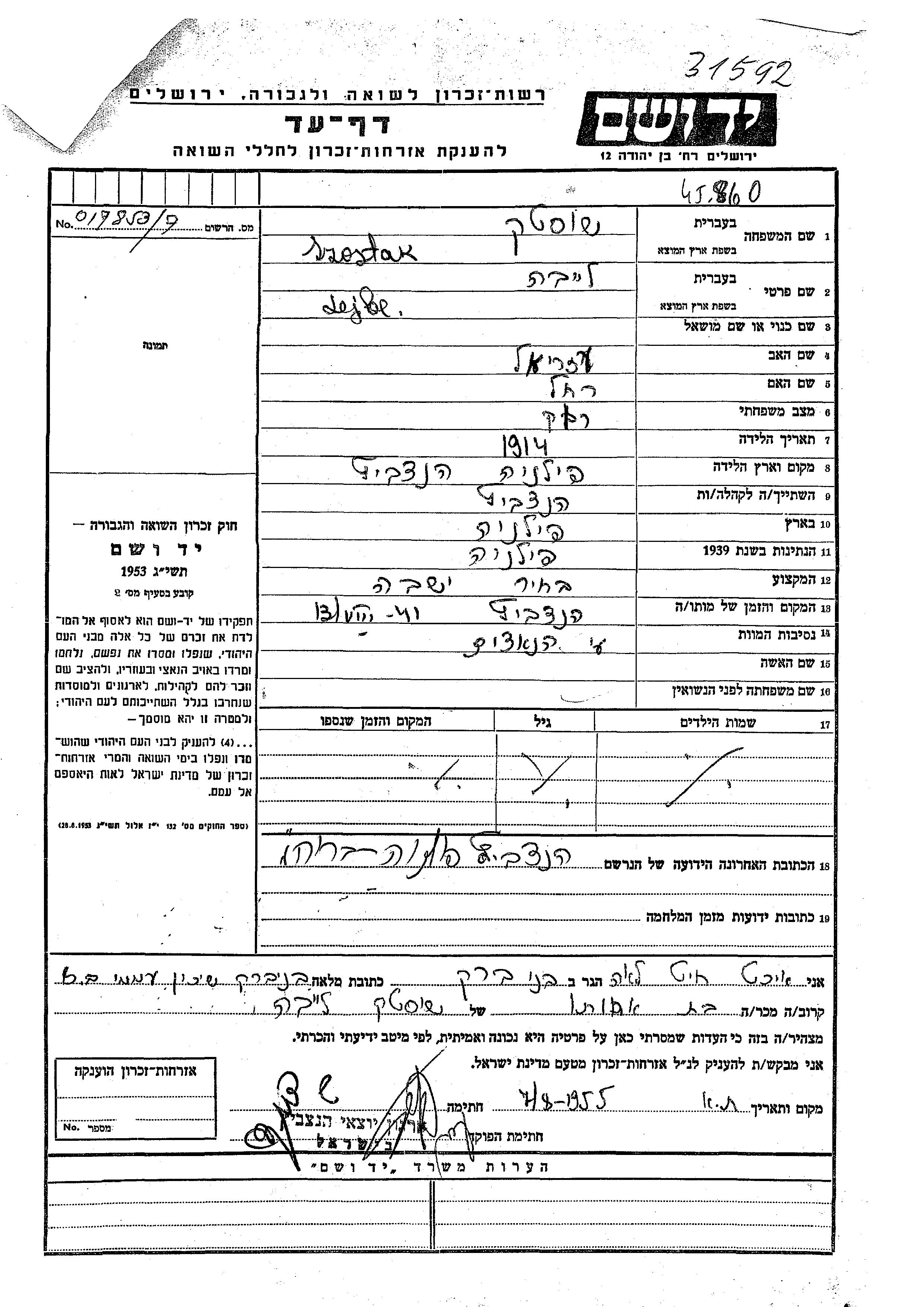 Liba Lejbe Szostak Chajet, geb. Shostak wurde im Jahr 1914 in Hancewicze, Polen geboren. Sie war Jeschiwahschüler. Vor dem Zweiten Weltkrieg lebte sie in Hancewicze, Polen. Liba Lejbe wurde in der Schoah ermordet. Todesort: Hancewicze, Polen im Jahr 13/08/1941.