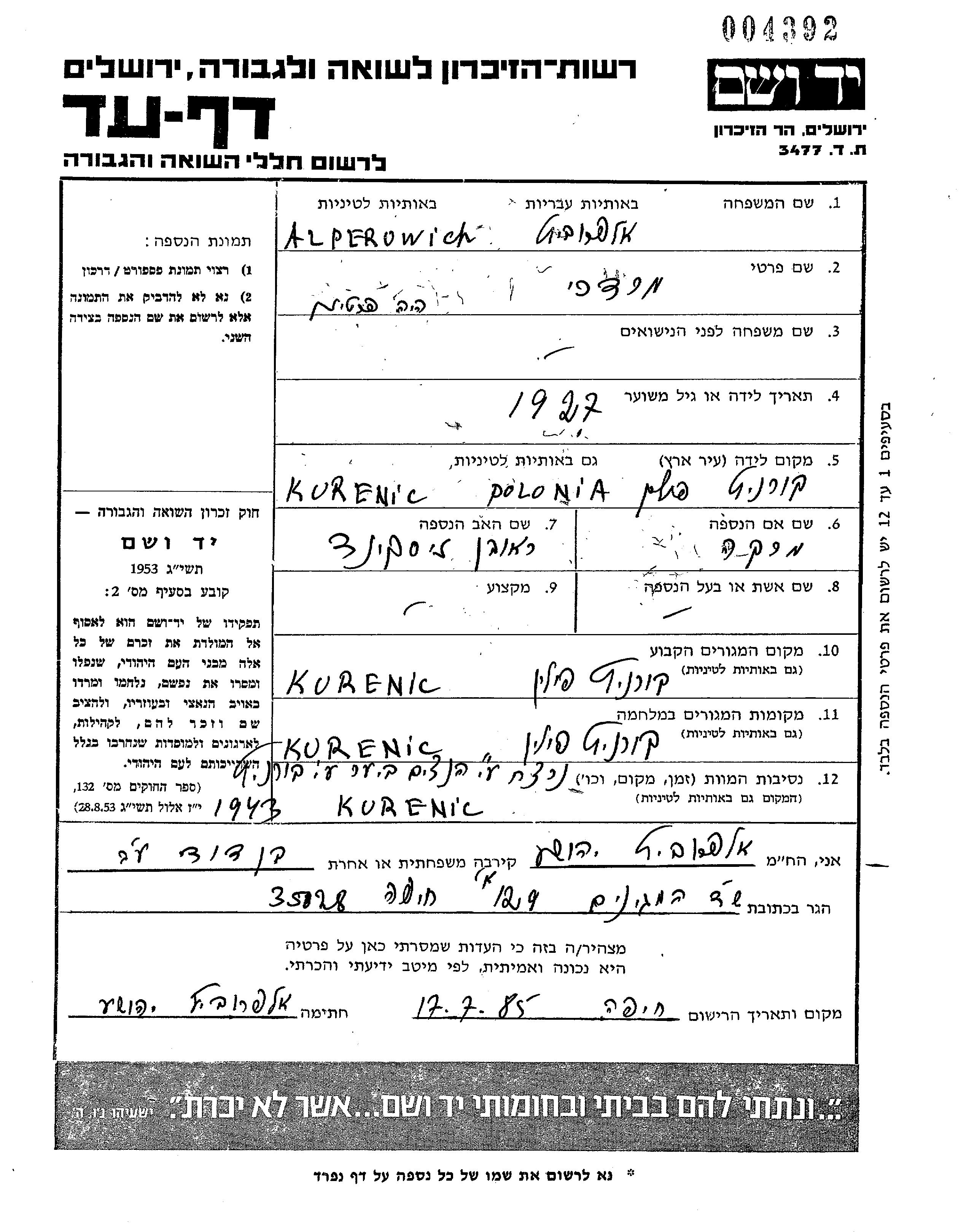 Alperowich Mordekhai 1927 Kurenets, Polen Gedenkblatt