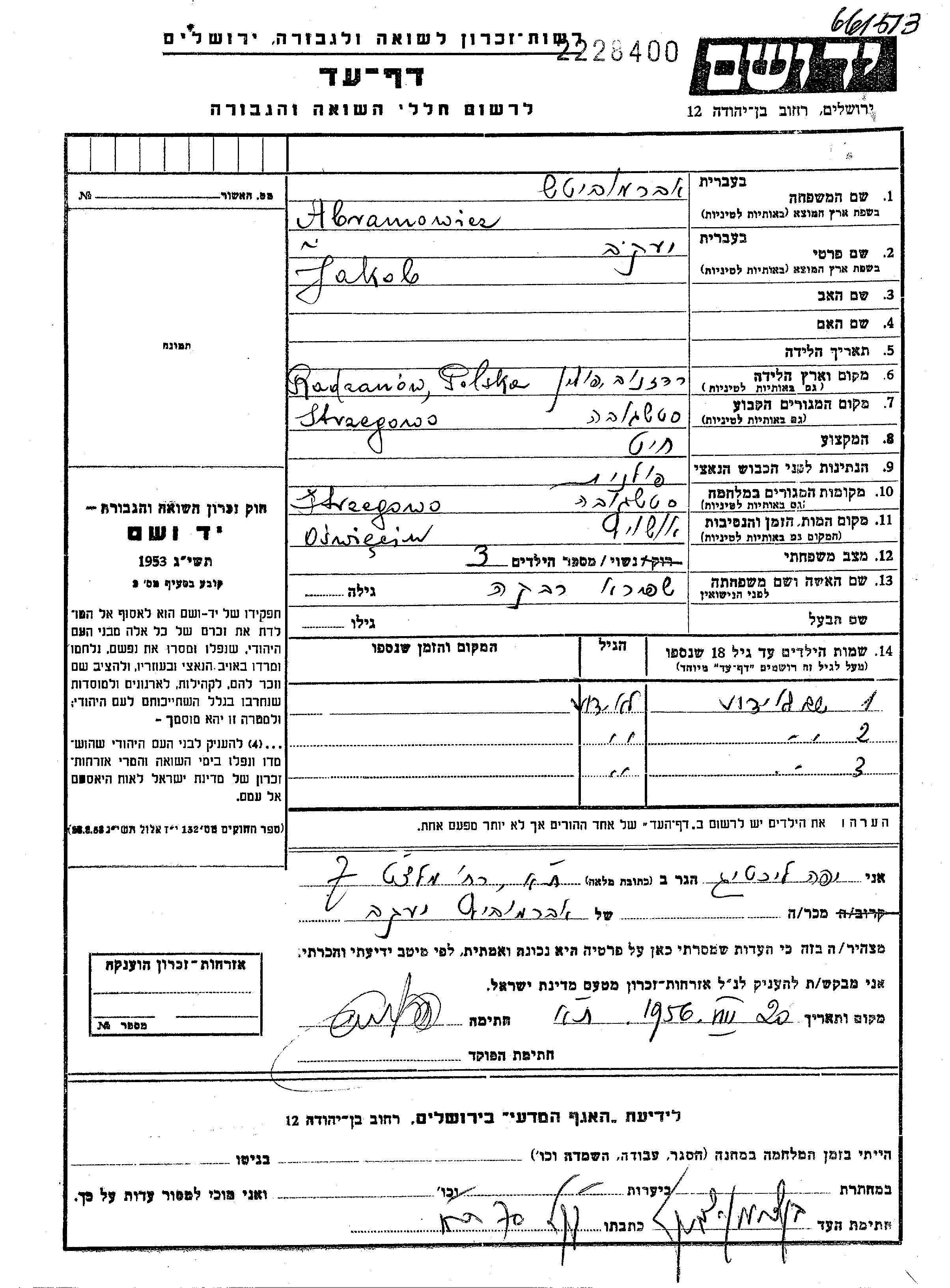 Ytzkhak Jakob Abramowicz wurde im Jahr 1898 in Radzanow, Polen geboren. Er war Schneider. Vor dem Zweiten Weltkrieg lebte er in Strzegowo, Polen.