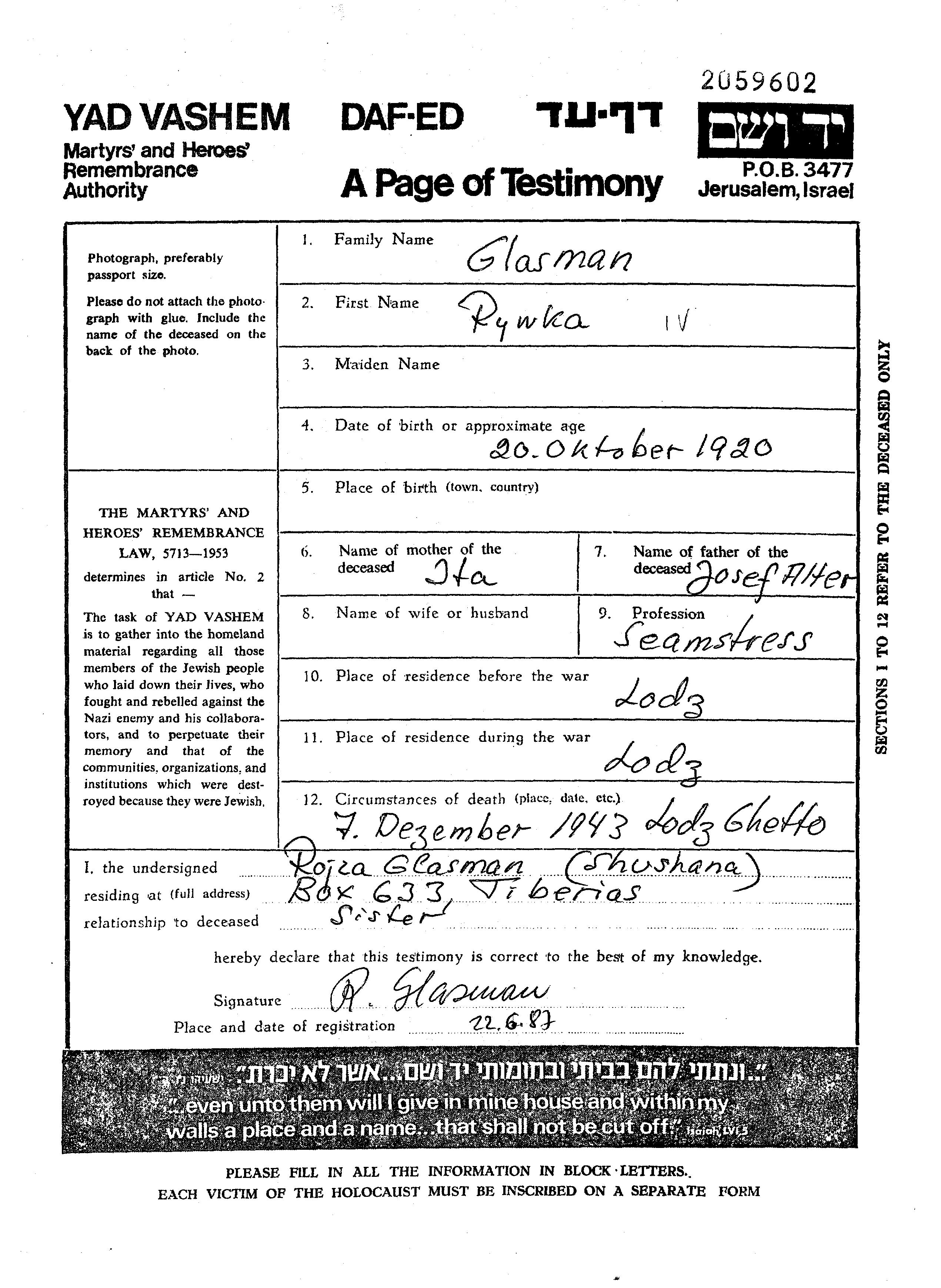 Rywka Glasman Glazman wurde im Jahr 1920 geboren. Sie war Schneiderin. Vor dem Zweiten Weltkrieg lebte sie in Lodz, Polen.