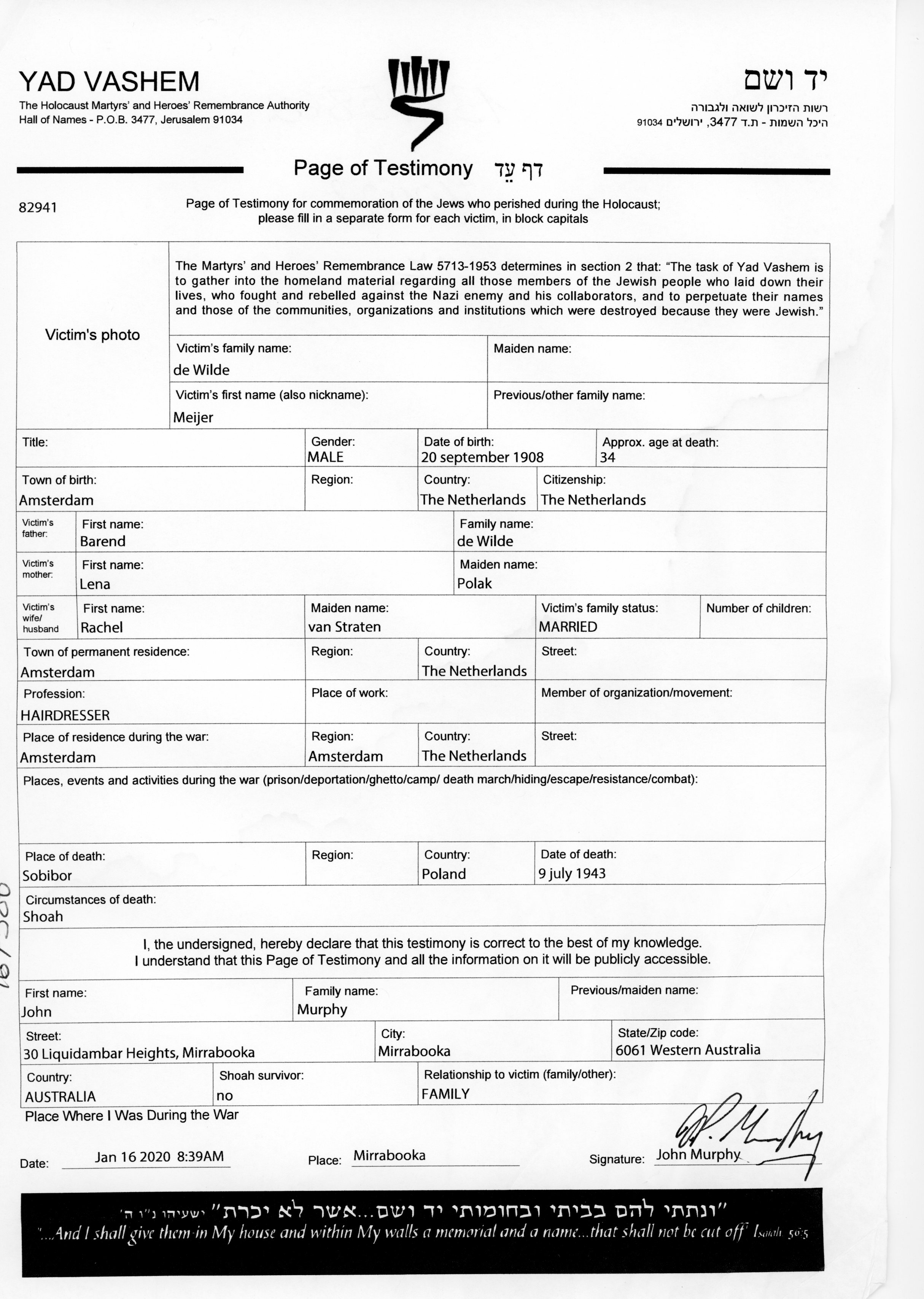 Wilde de | Meijer | 1908 | Amsterdam, Niederlande | Liste von ermordeten Juden aus Holland |