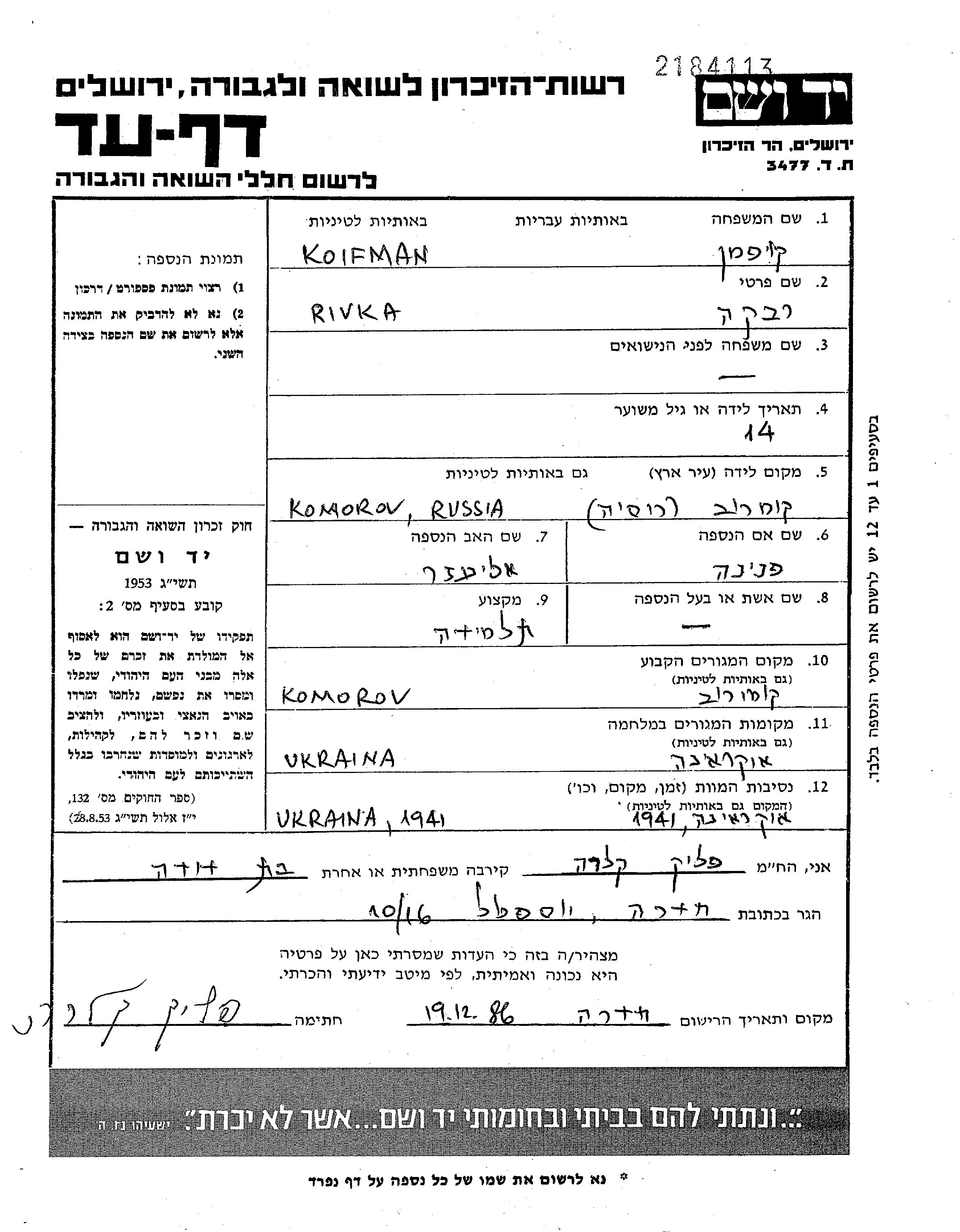 Rivka wurde in der Schoah ermordet. Todesort: Ukraine (UdSSR) im Jahr 1941.