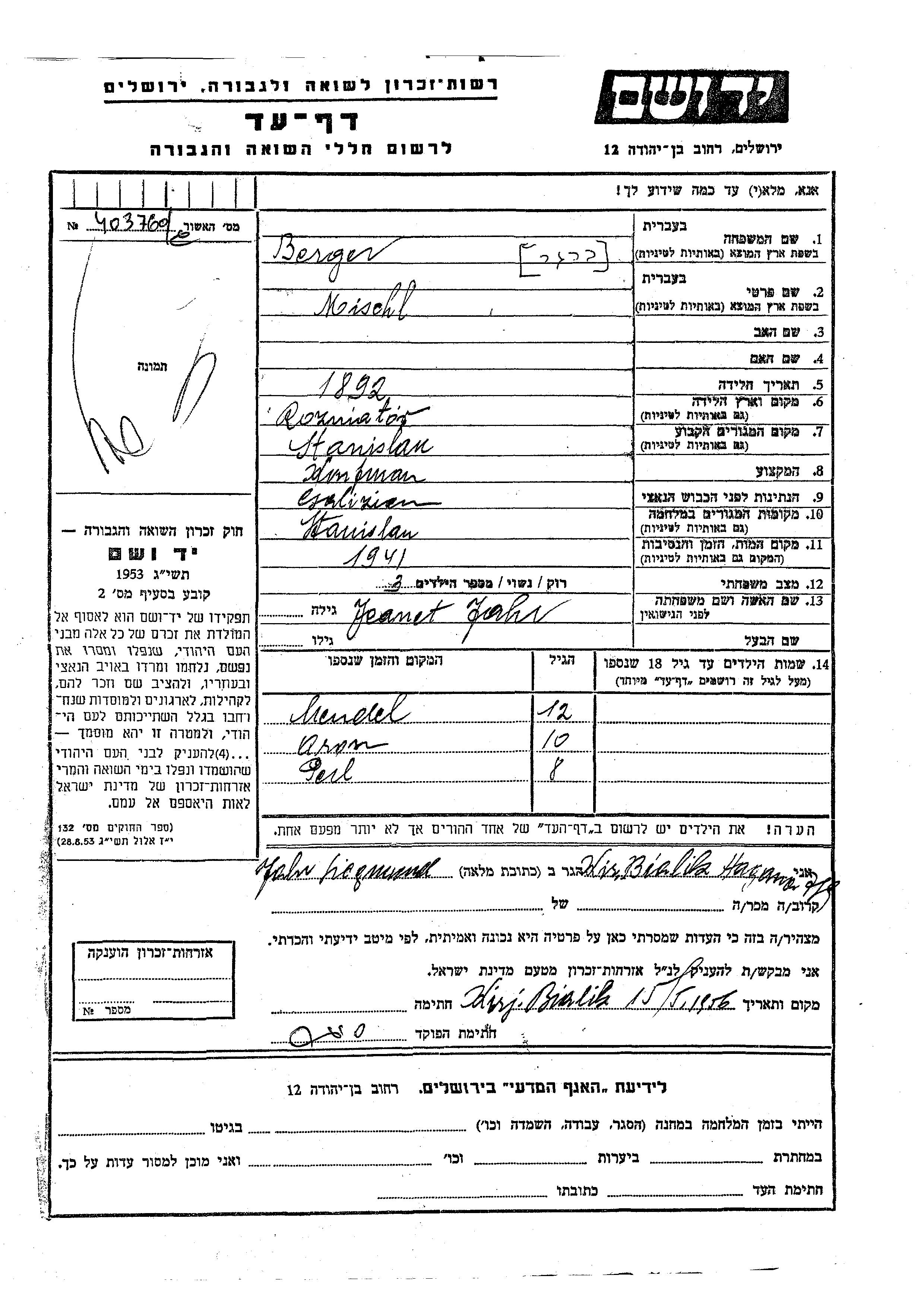 Perl Berger. Vor dem Zweiten Weltkrieg lebte sie in Stanislawow, Polen.