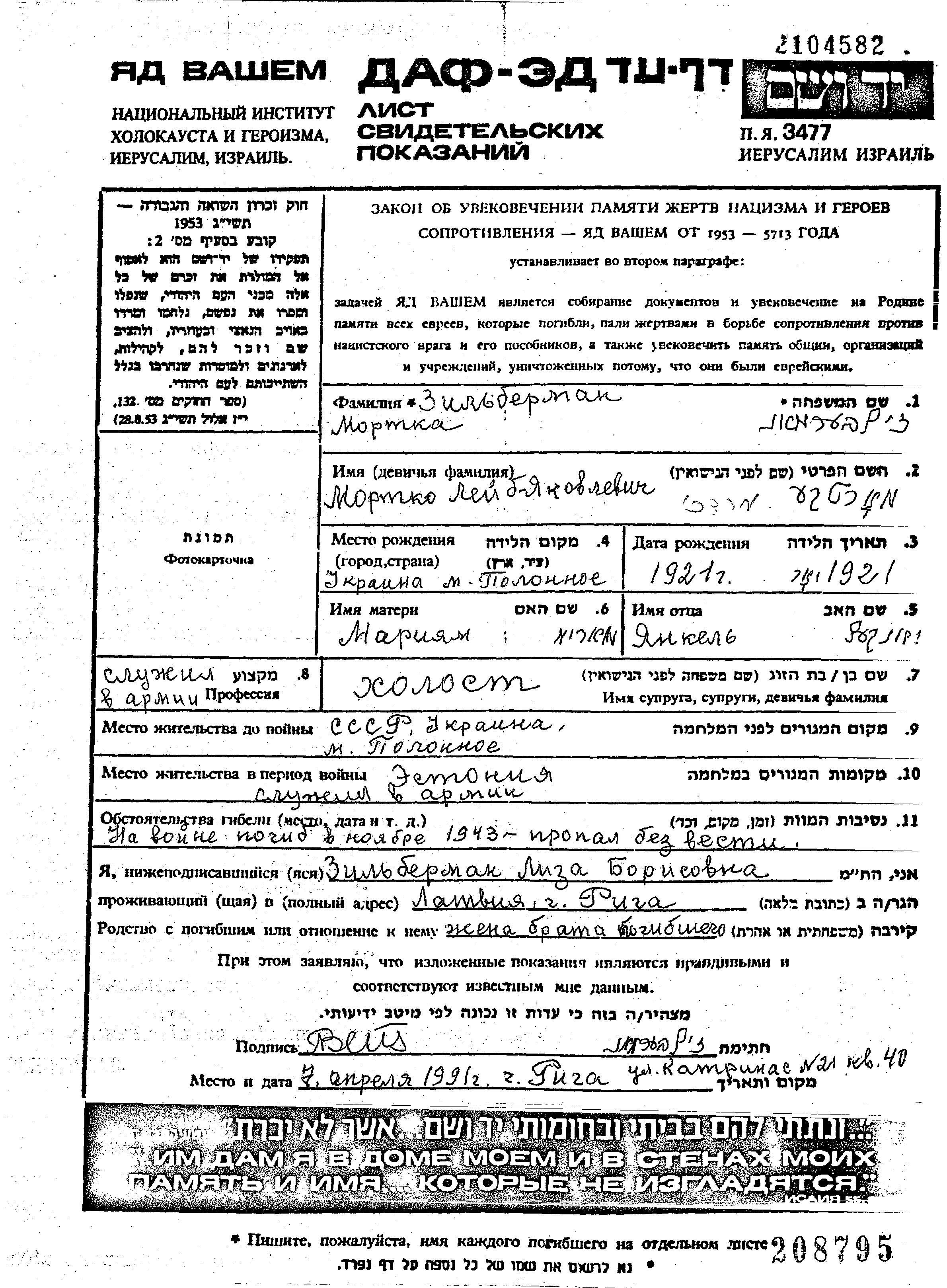 Mortka Leib Zilberman wurde im Jahr 1921 in Polonnoye, Ukraine (UdSSR) geboren. Er war Soldat. Vor dem Zweiten Weltkrieg lebte er in Polonnoye, Ukraine (UdSSR).