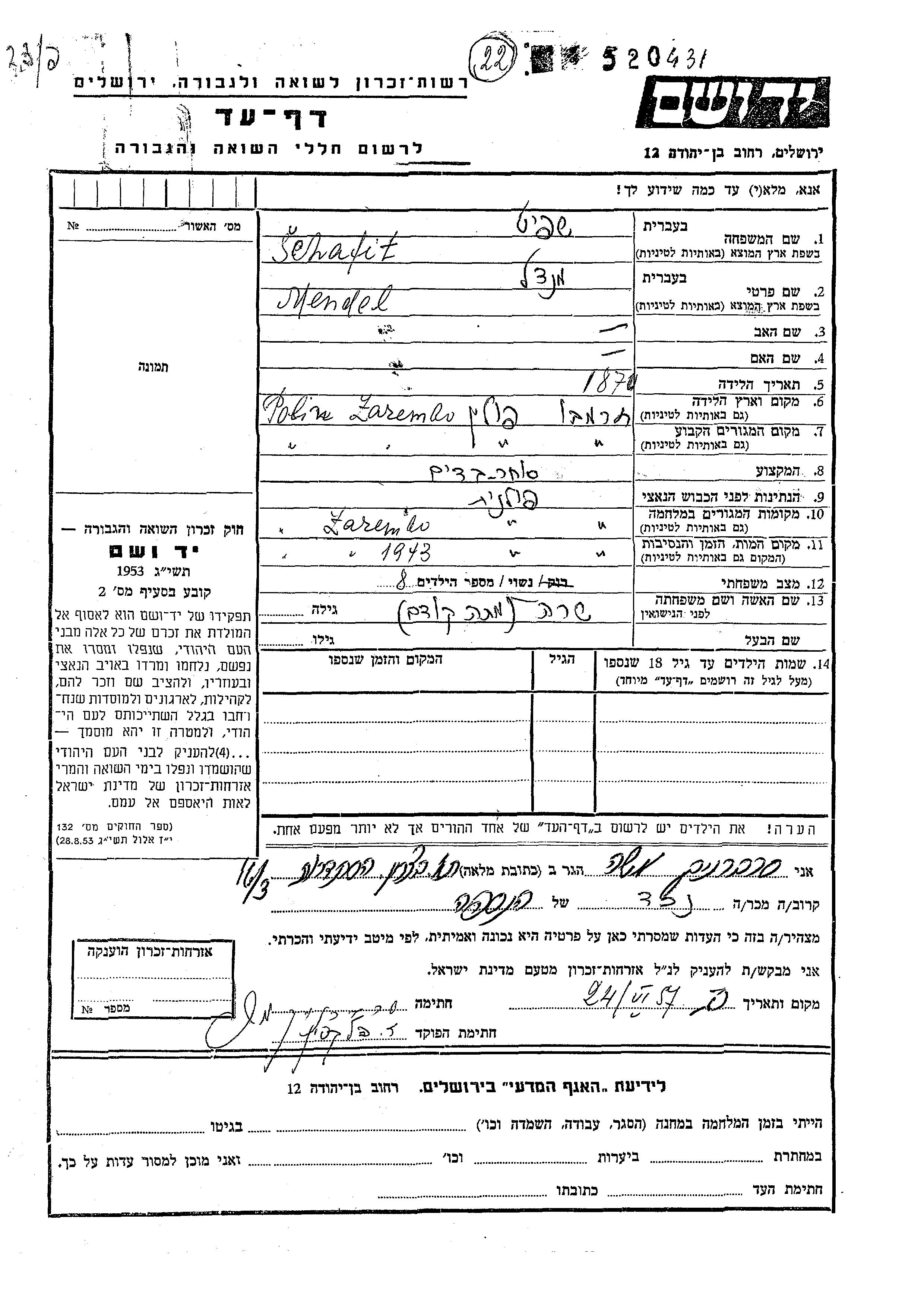 Mendel wurde in der Schoah ermordet. Todesort: Zarembo, Polen im Jahr 1943.