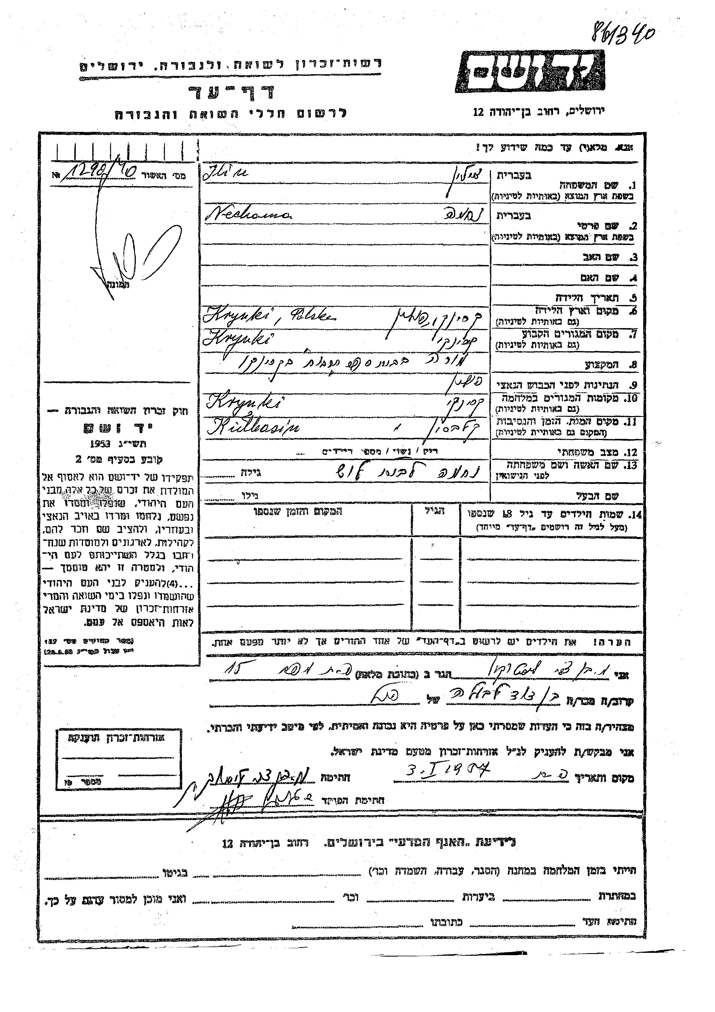 Nechama Ilin, geb. Lush wurde in Krynki, Polen geboren. Sie war Lehrer/in und Verheiratet. Vor dem Zweiten Weltkrieg lebte sie in Krynki, Polen. Während des Krieges war sie in Krynki, Polen.