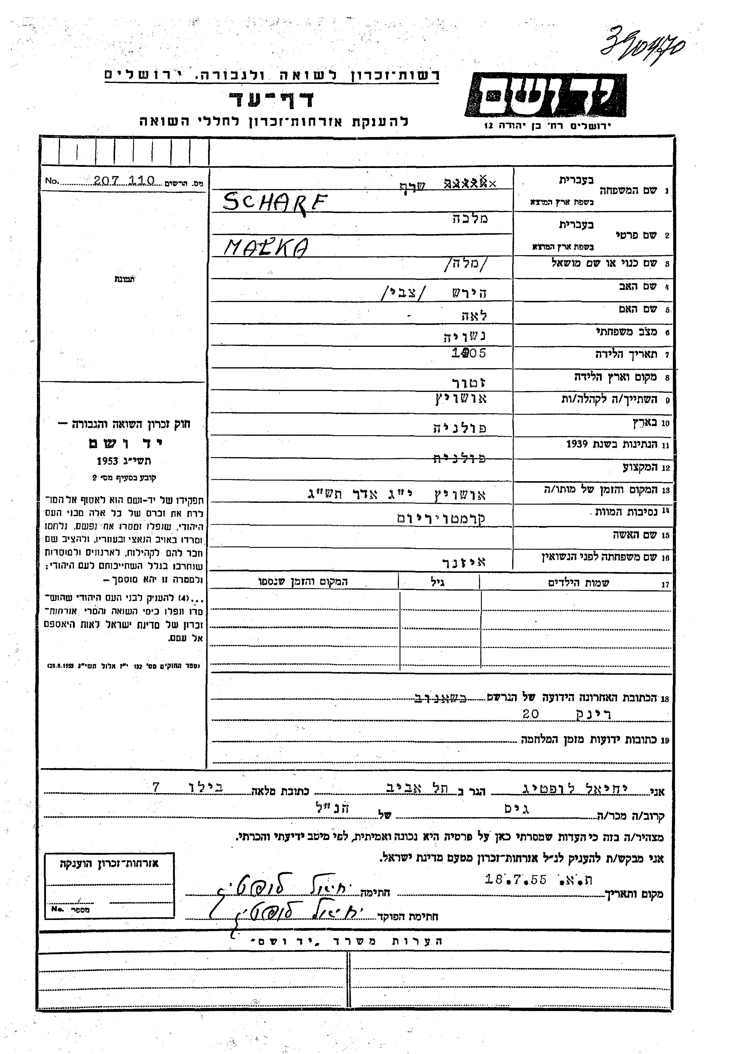 Malka Scharf, geb. Eizner wurde im Jahr 1905 in Zator, Polen geboren. Sie war die Tochter von Hirsh Tzvi und Lea. Sie war Verheiratet. Während des Krieges war sie in Chrzanow, Polen.