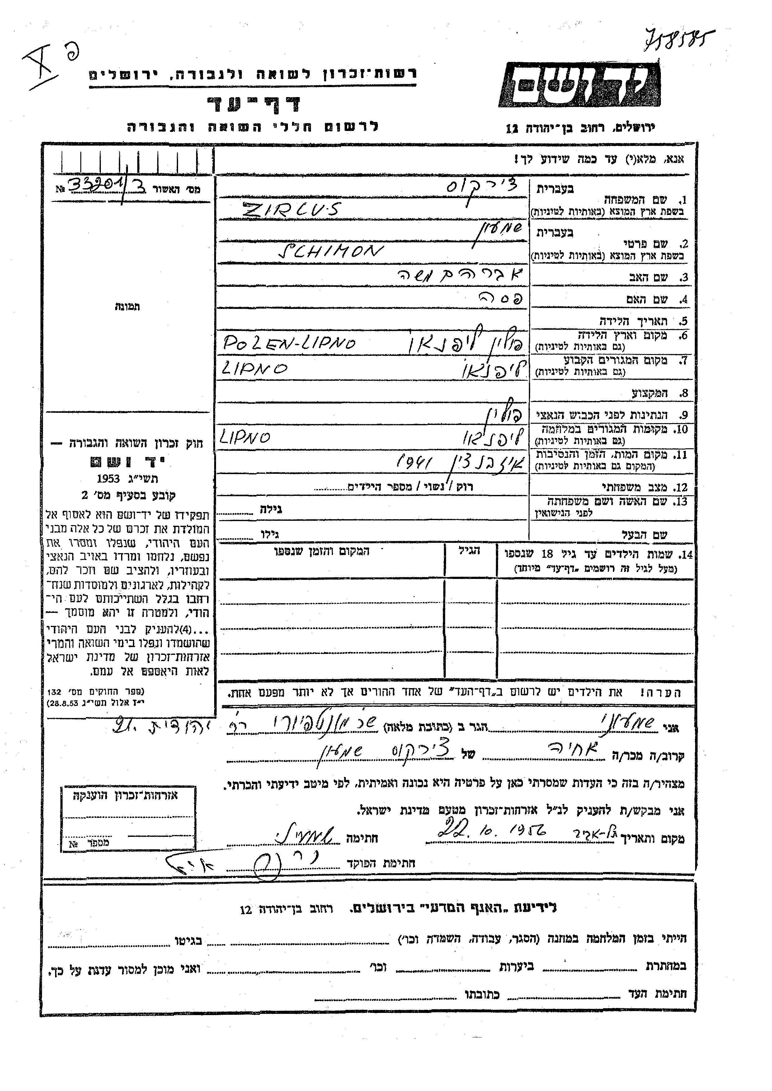 Schimon Yehoshua Zircus wurde in Lipno, Polen geboren. Vor dem Zweiten Weltkrieg lebte er in Lipno, Polen.