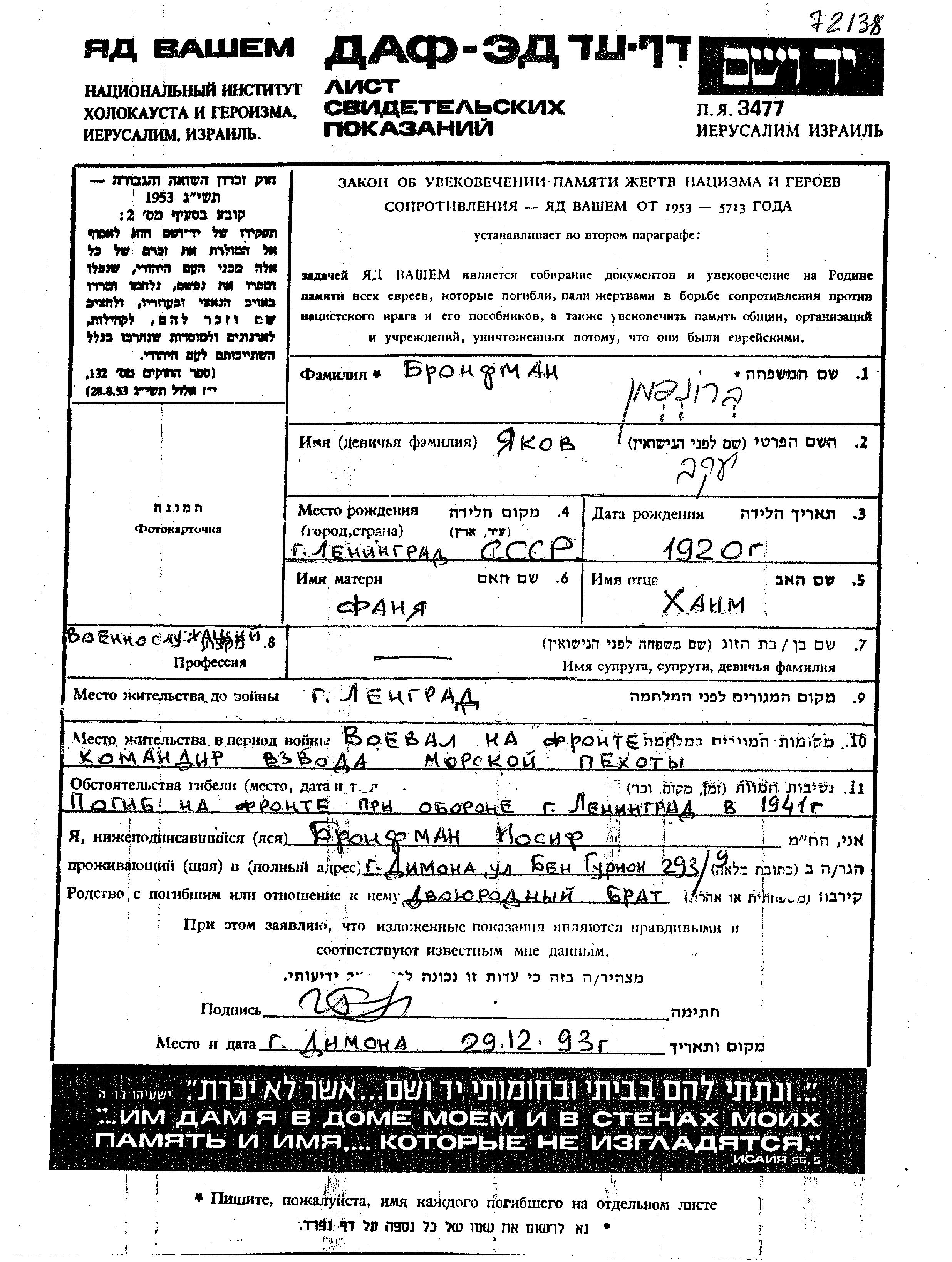 Bronfman | Yakov | 1920 | Leningrad, Russland (UdSSR) | Gedenkblatt |