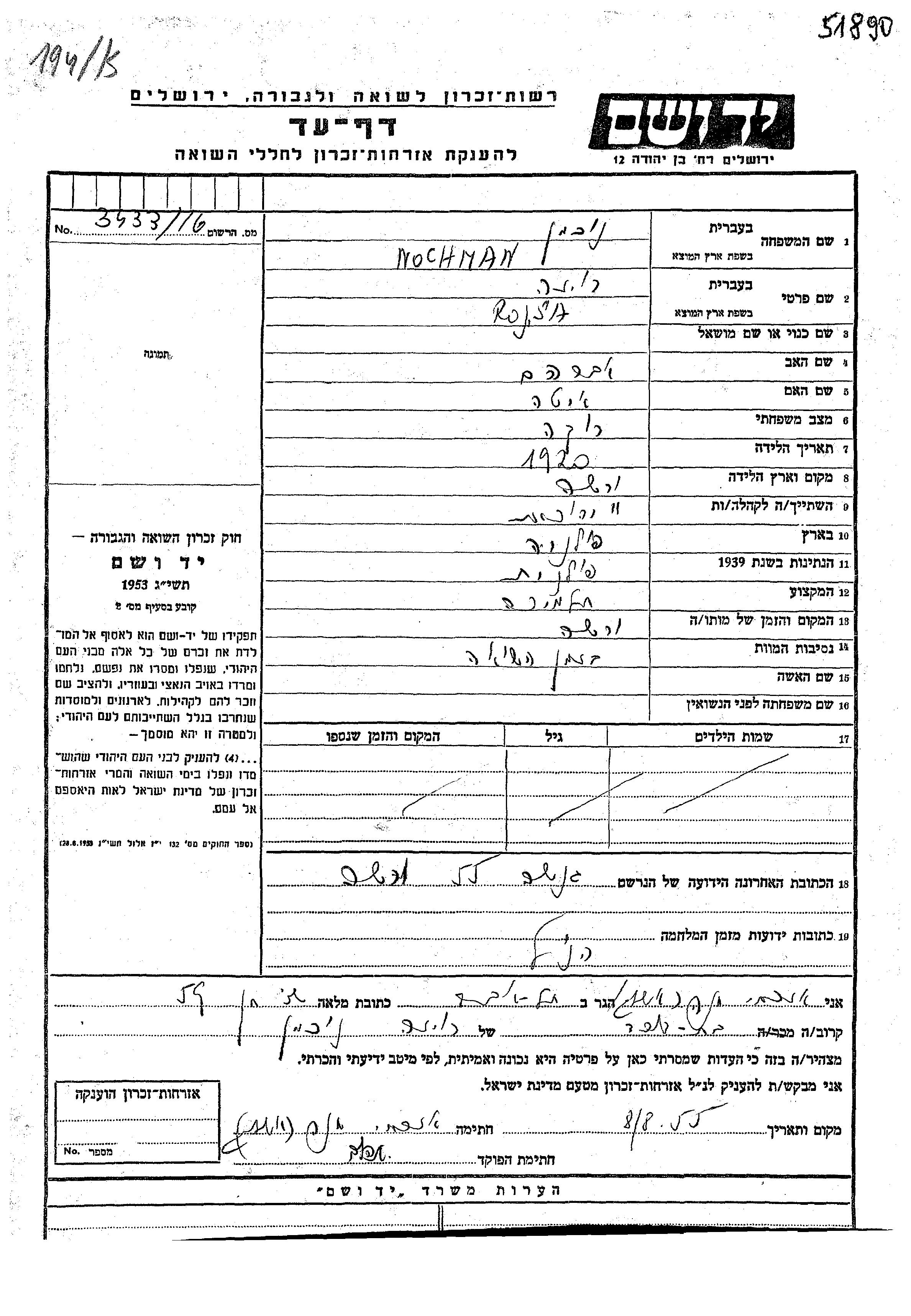 Roza Nochman wurde im Jahr 1920 in Warszawa, Polen geboren. Sie war Schüler/-in. Vor dem Zweiten Weltkrieg lebte sie in Warszawa, Polen.