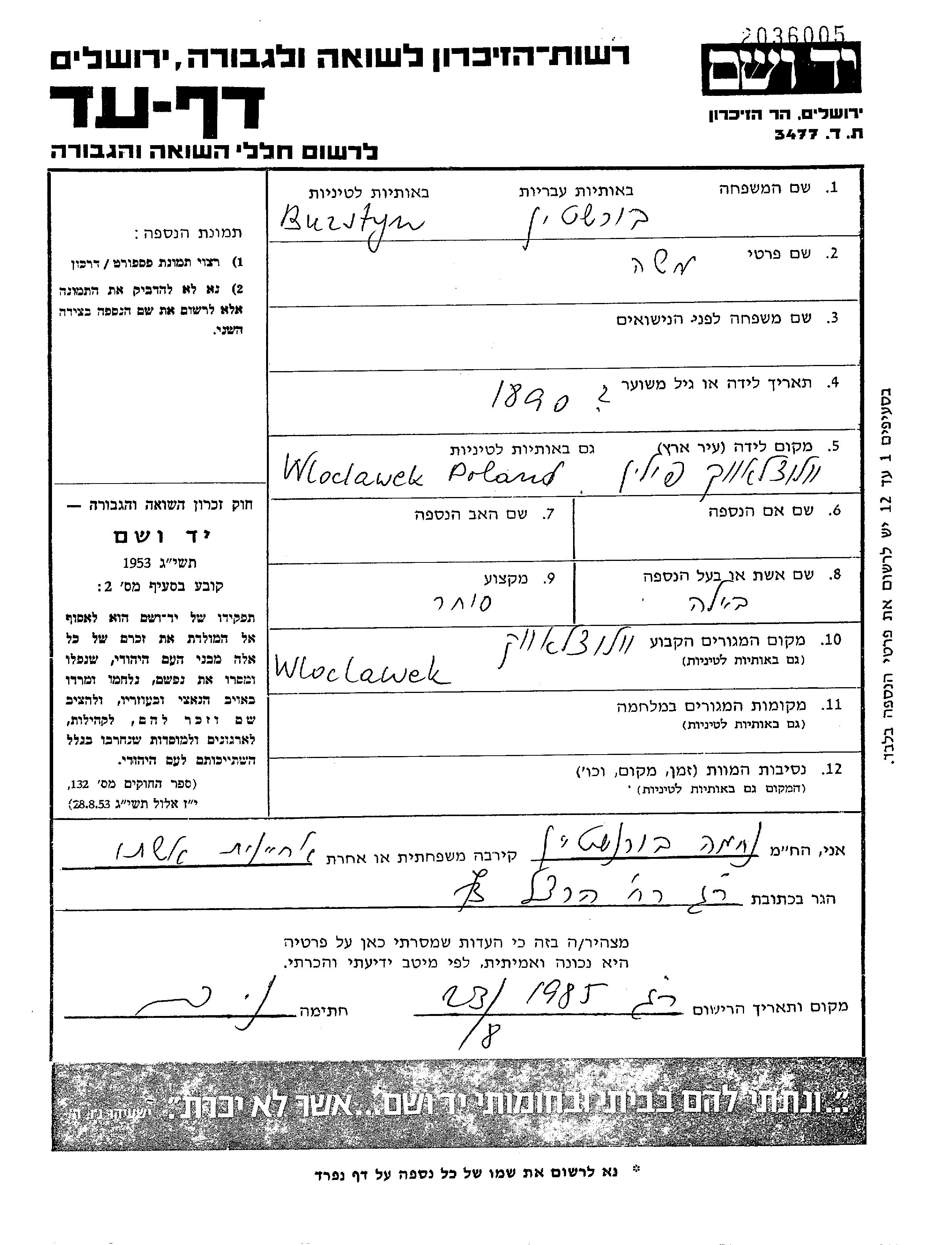 Moshe Burstyn wurde im Jahr 1890 in Wloclawek, Polen geboren. Er war Kaufmann/-frau. Vor dem Zweiten Weltkrieg lebte er in Wloclawek, Polen.
