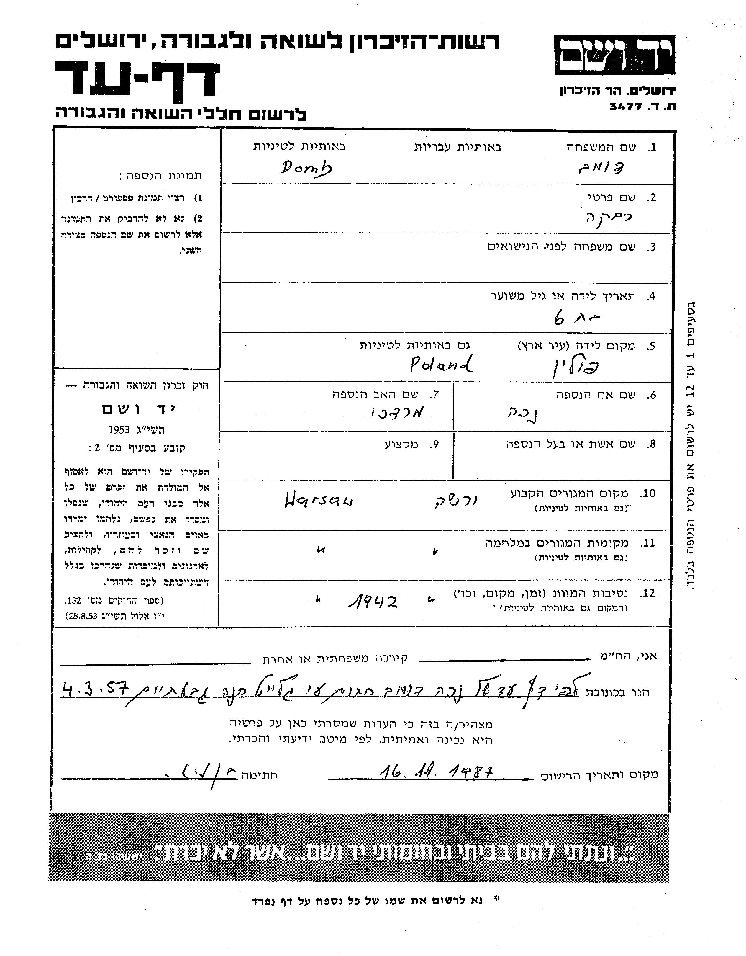 Domb Rivka Warszawa, Polen Gedenkblatt