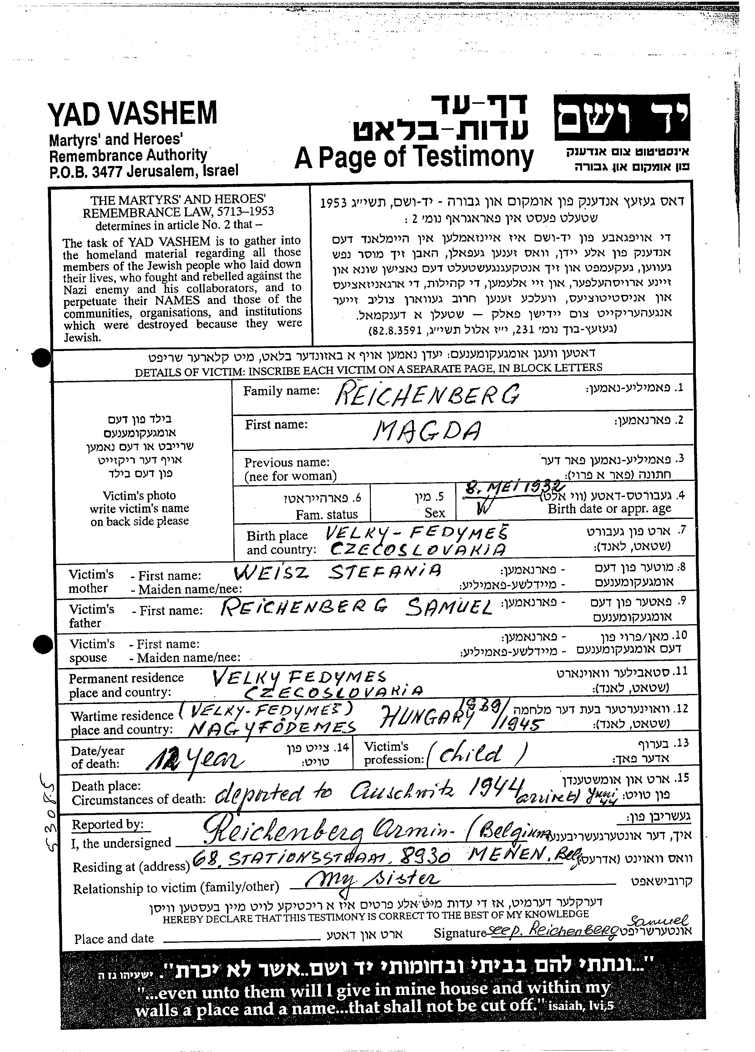 Reichenberg | Magda | 1932 | Velky Fedymes, Tschechoslowakei | Gedenkblatt |