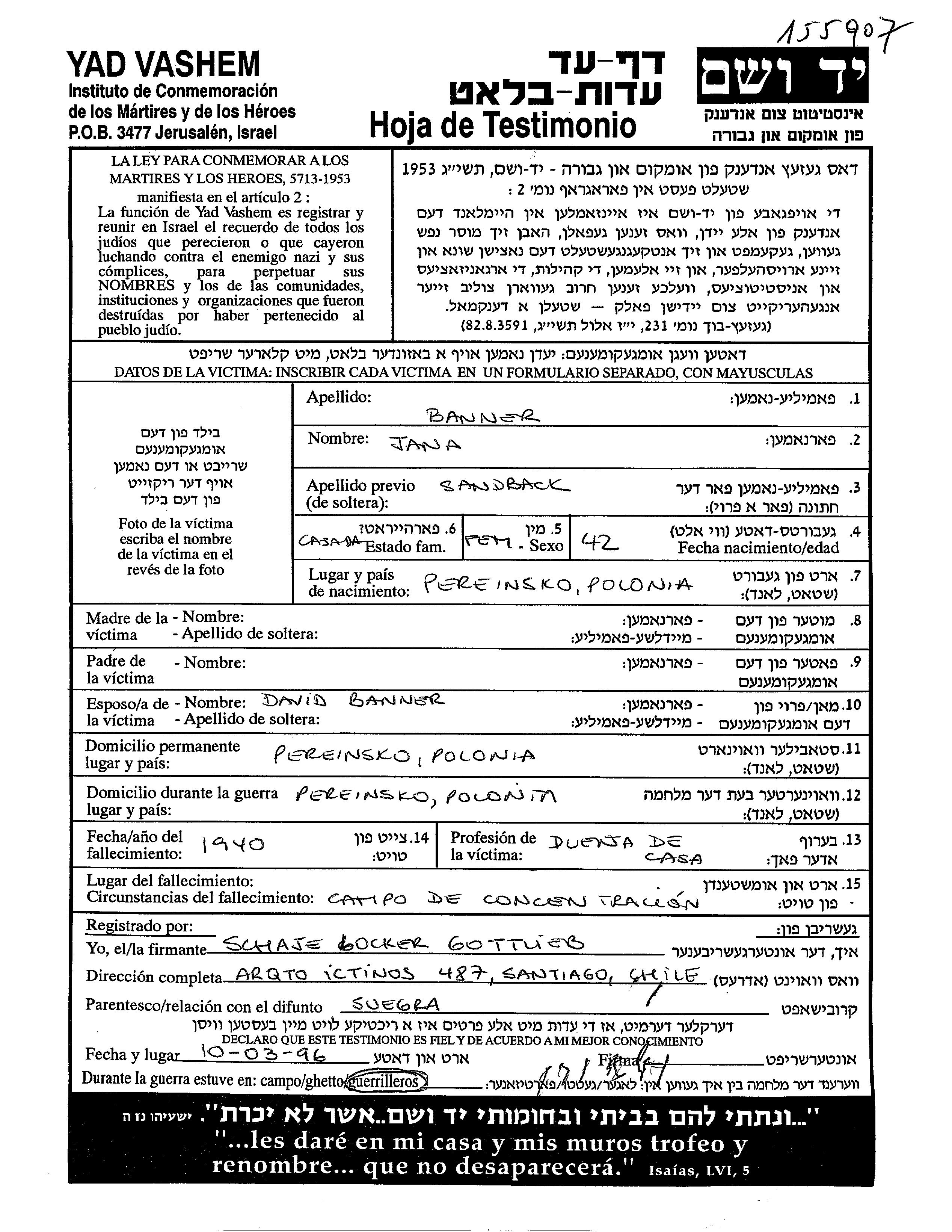 Jana Banner, geb. Sandback wurde in Perehinsko, Polen geboren. Sie war Duena de casa und mit David Verheiratet. Vor dem Zweiten Weltkrieg lebte sie in Perehinsko, Polen. Während des Krieges war sie in Perehinsko, Polen.