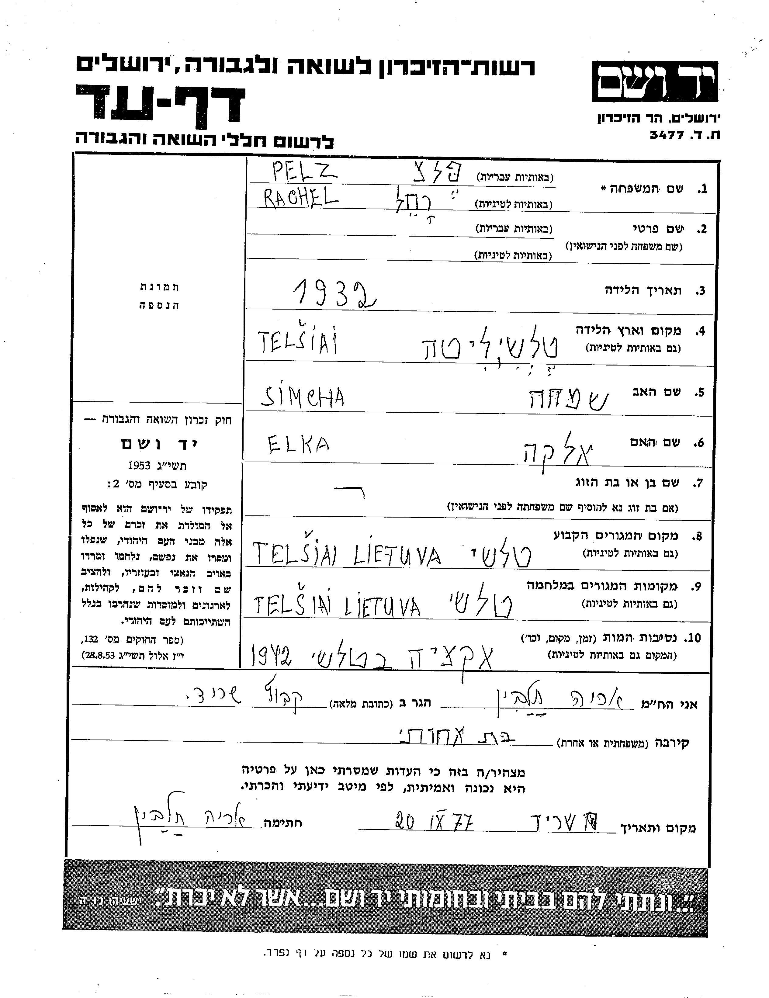 Rachel Pelz wurde im Jahr 1932 in Telsiai, Litauen geboren. Vor dem Zweiten Weltkrieg lebte sie in Telsiai, Litauen.