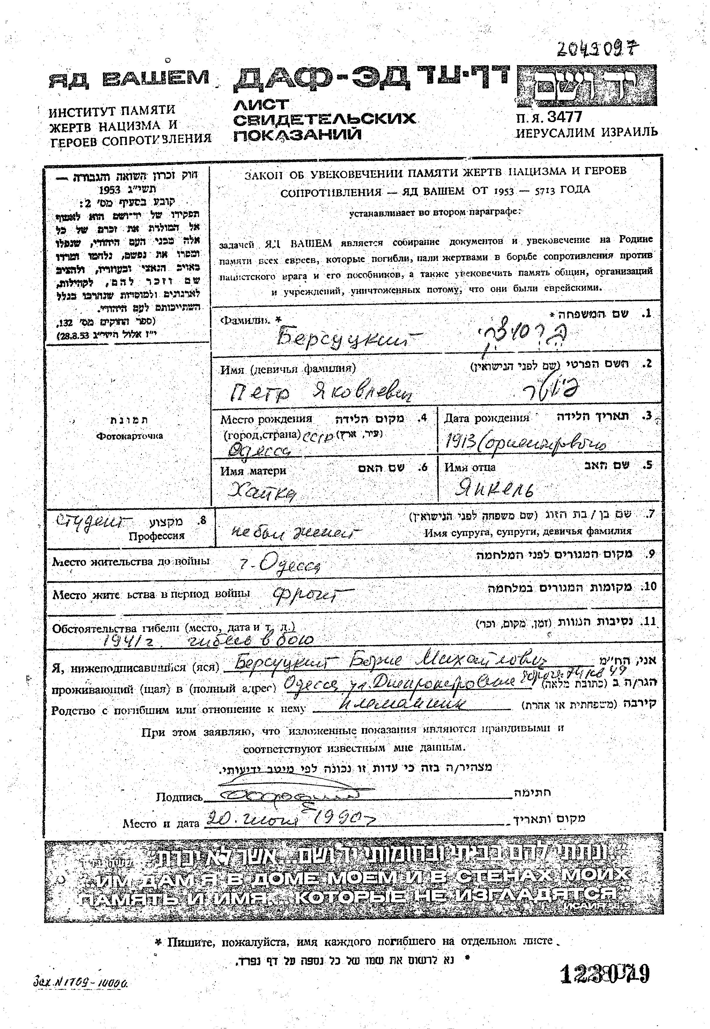 Bersutzki Piotr 1913 Odessa, Ukraine (UdSSR) Gedenkblatt