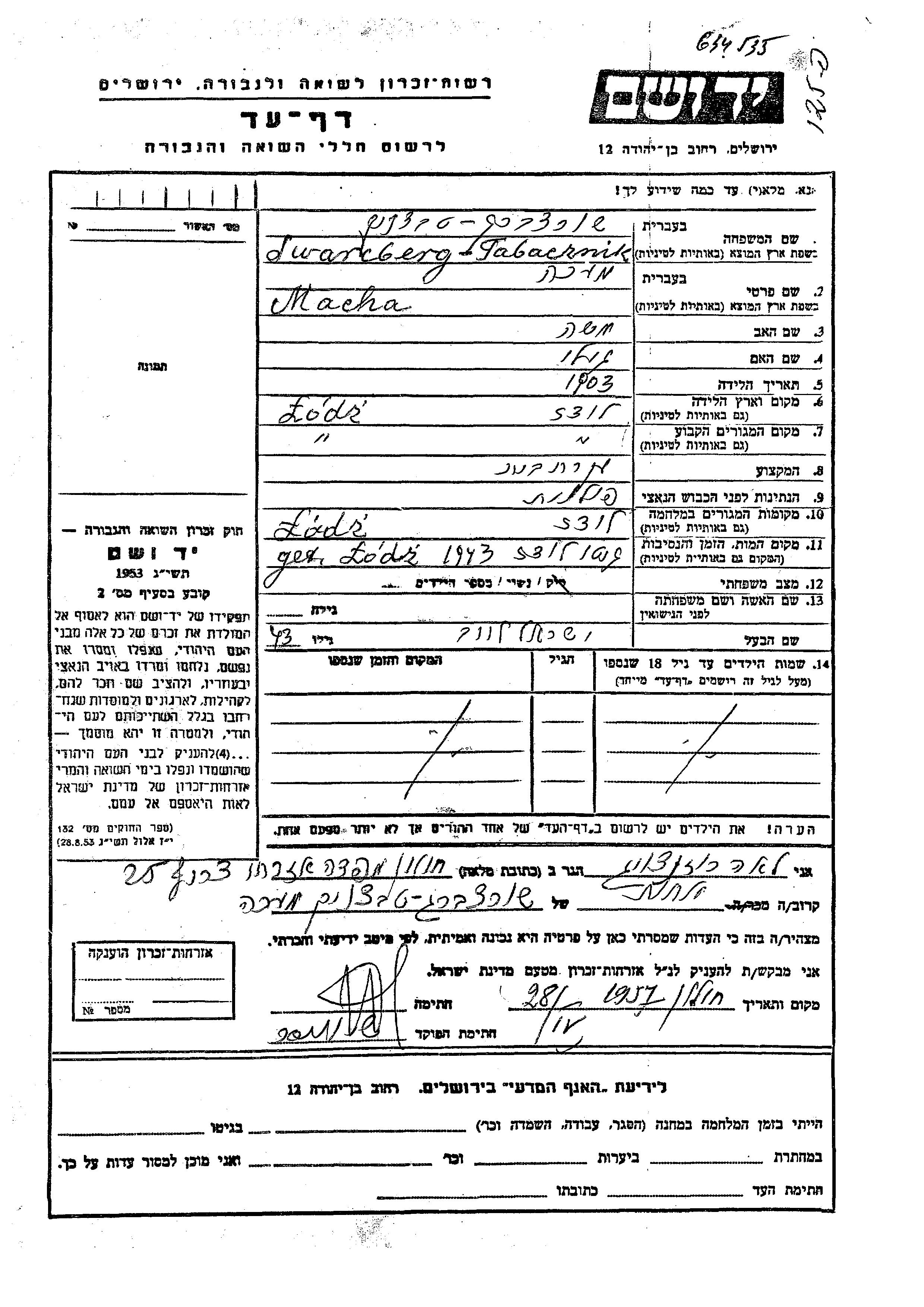 Macha Makha Swarcberg Tabacznik wurde im Jahr 1903 in Lodz, Polen geboren. Sie war die Tochter von Moshe und Gela. Sie war Hausfrau und mit Yisrael Leib Verheiratet. Vor dem Zweiten Weltkrieg lebte sie in Lodz, Polen. Während des Krieges war sie in Lodz, Polen.