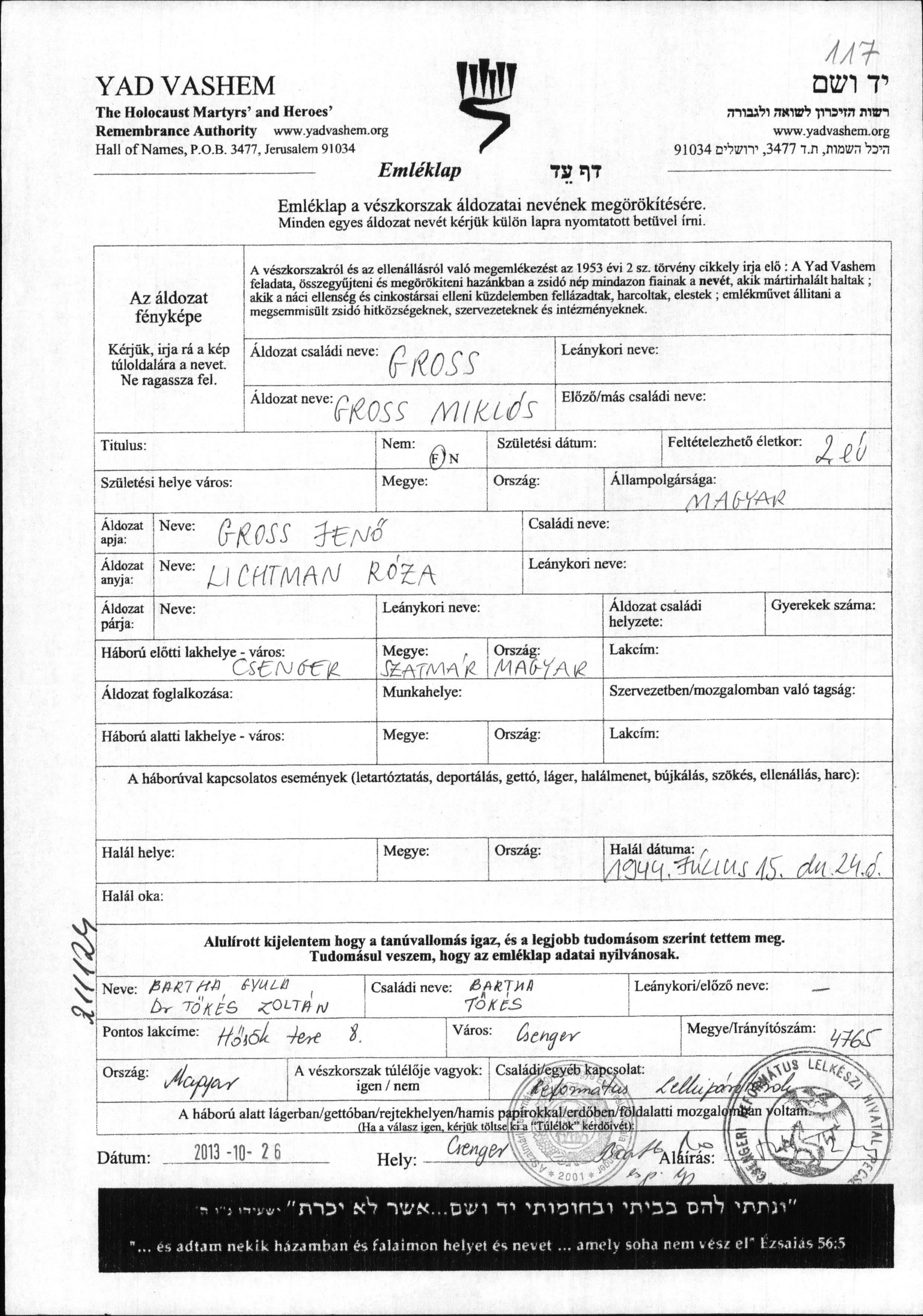 Gross Miklos Csenger, Ungarn Liste von ermordeten Juden aus Ungarn
