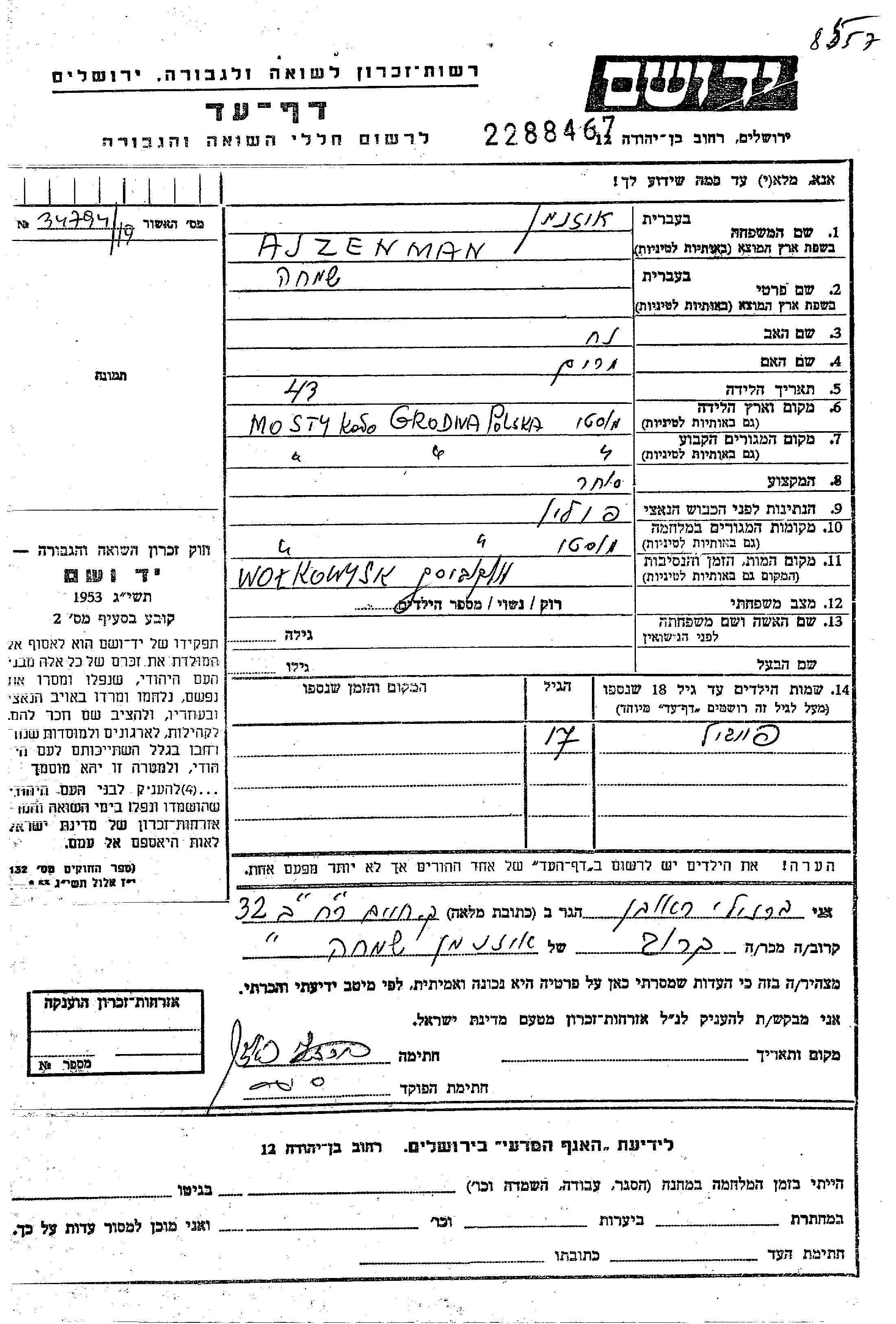 Simkha Ajzenman wurde in Mosty, Polen geboren. Vor dem Zweiten Weltkrieg lebte er in Mosty, Polen.