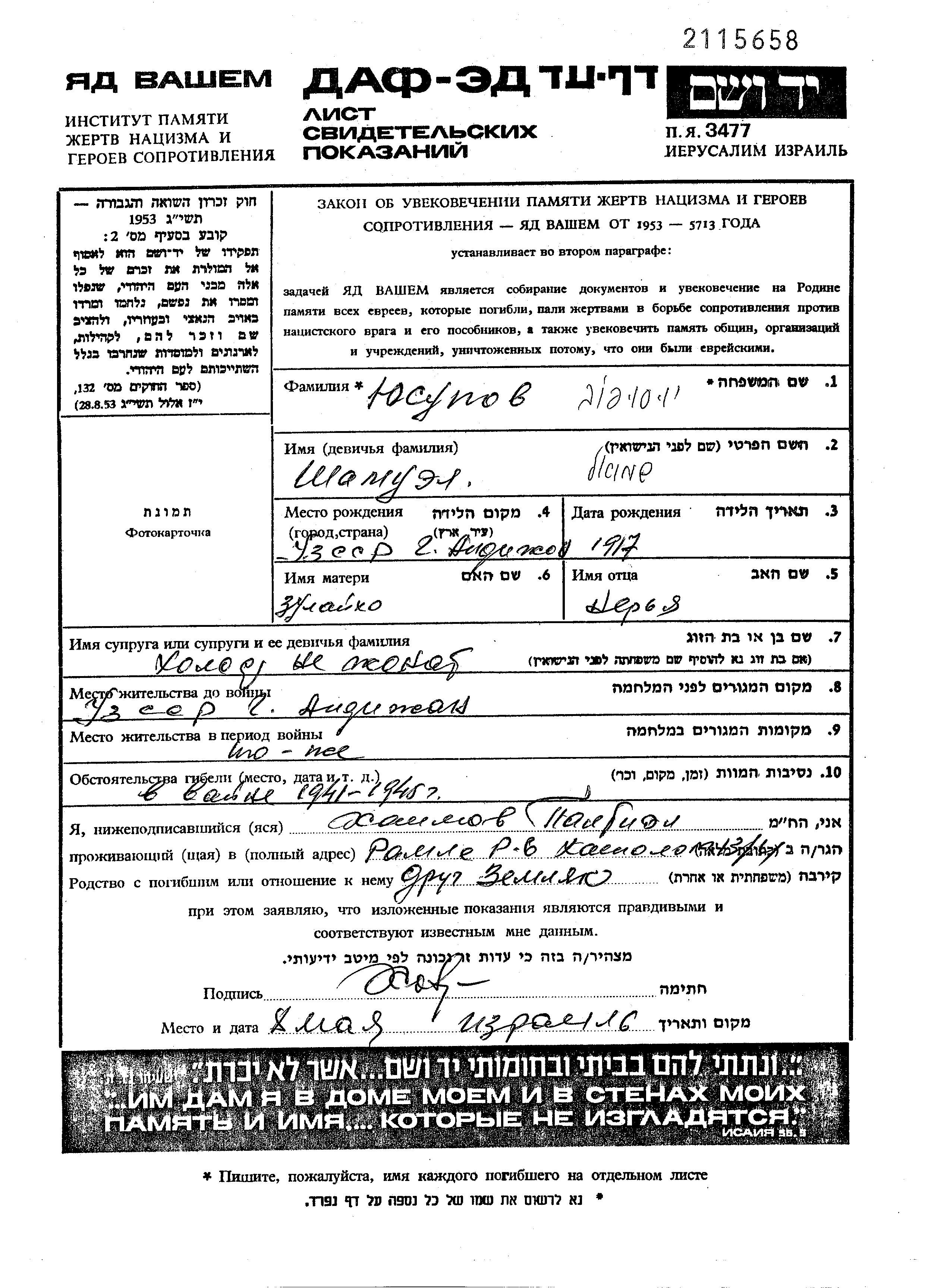 Shmuel Yusupov wurde in Andizhan, Uzbekistan (UdSSR) geboren. Vor dem Zweiten Weltkrieg lebte er in Andizhan, Uzbekistan (UdSSR).