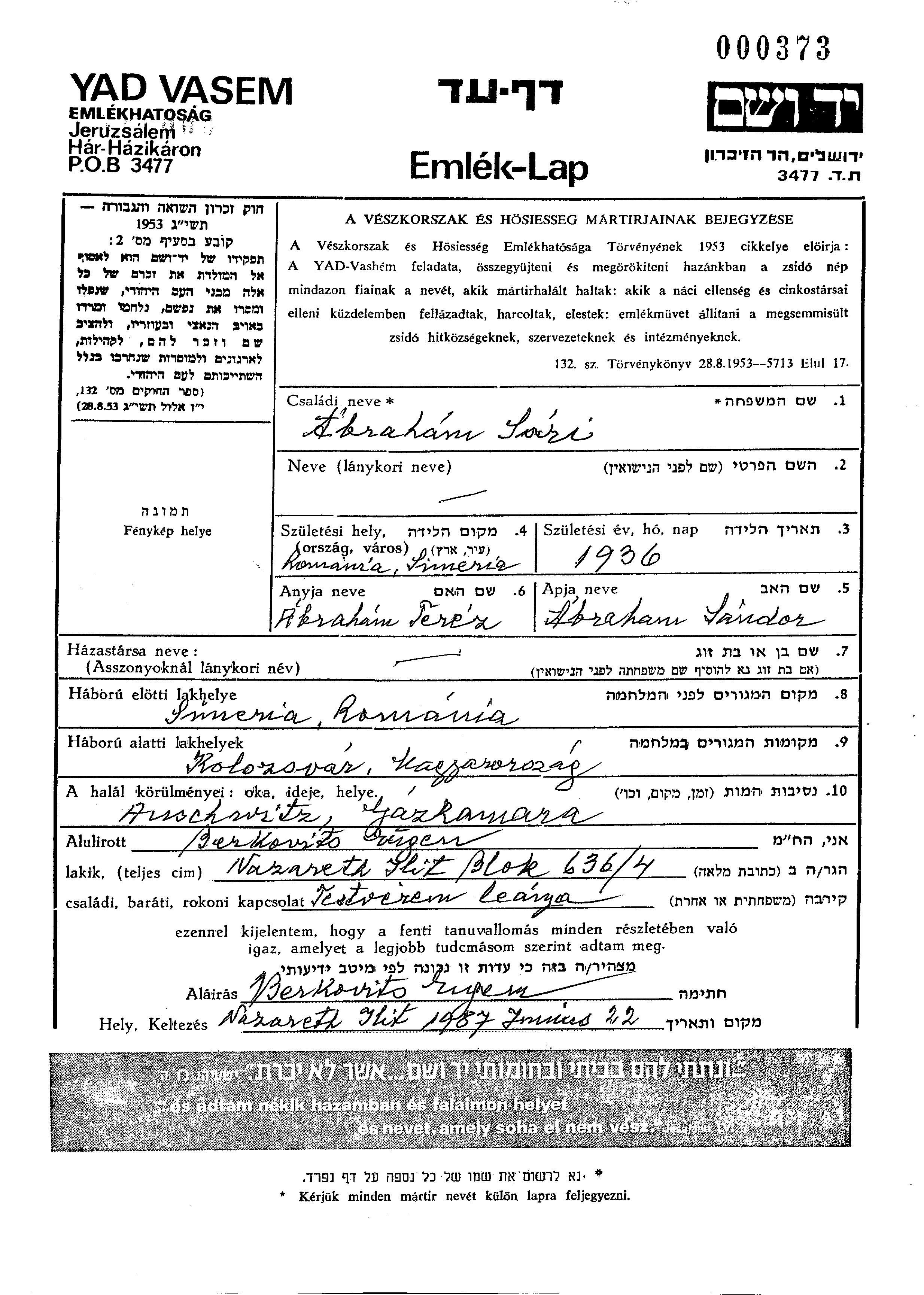 Abraham Sari 1936 Simeria, Rumänien Gedenkblatt