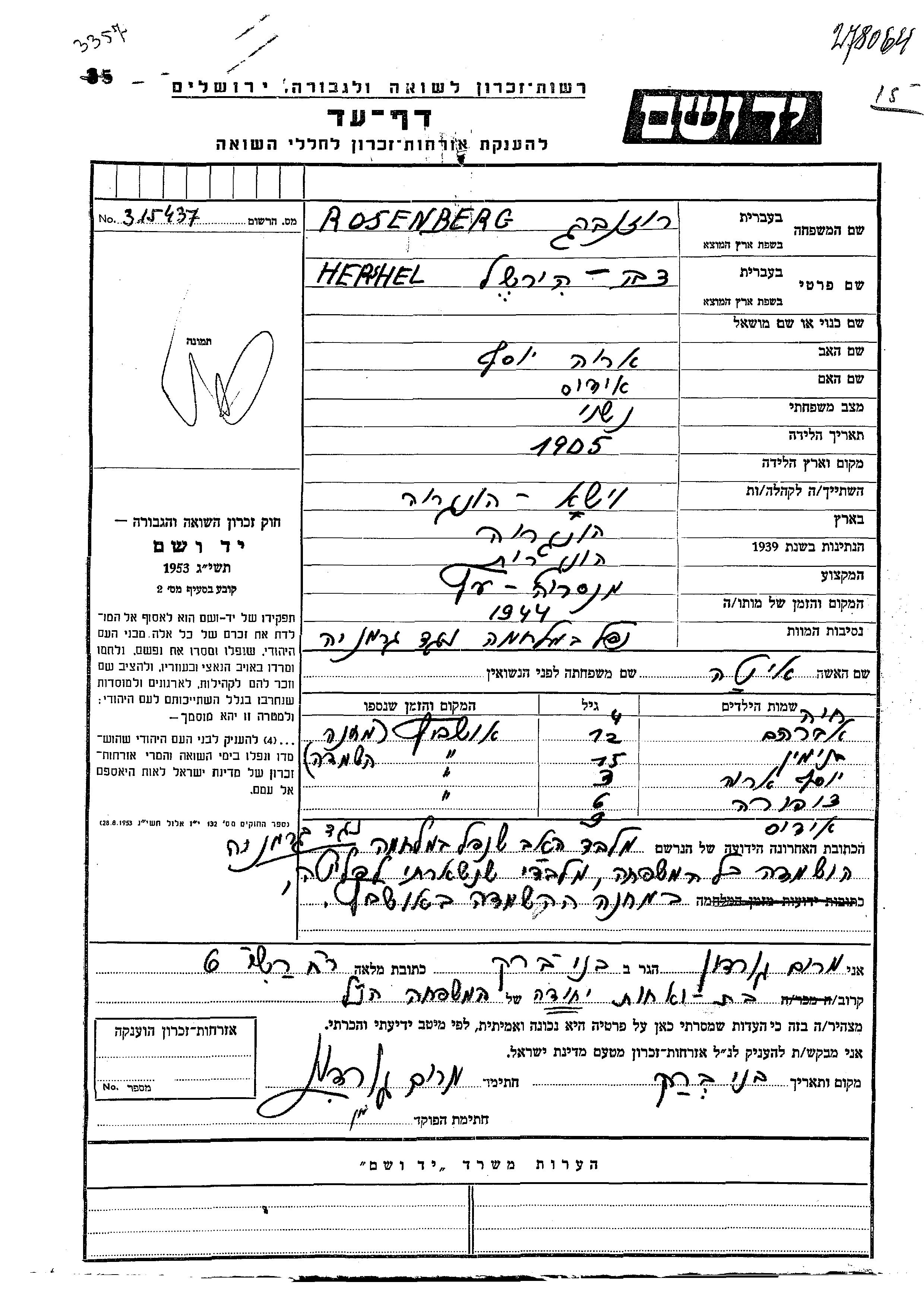 Hershel Tzvi Rosenberg wurde im Jahr 1905 geboren. Er war der Sohn von Arie Yosef und Yehudit. Er war Sägewerk und mit Ita Verheiratet. Vor dem Zweiten Weltkrieg lebte er in Viseu, Rumänien. Während des Krieges war er in Auschwitz, Polen.