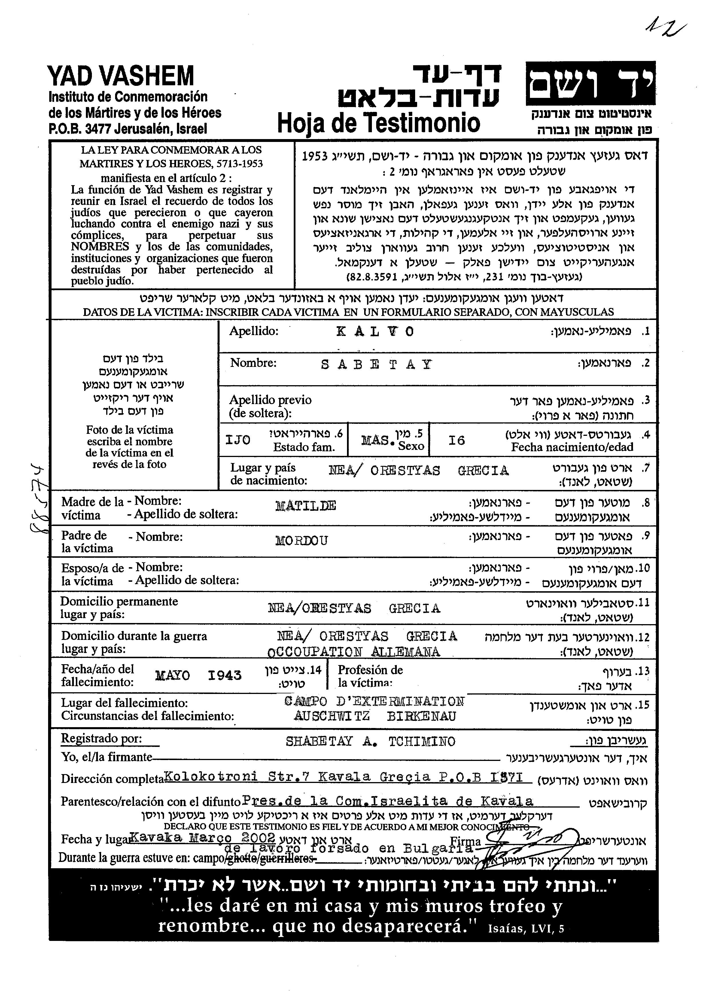 | Kalvo | Shabtai | Nea Orestias, Griechenland | Gedenkblatt | |