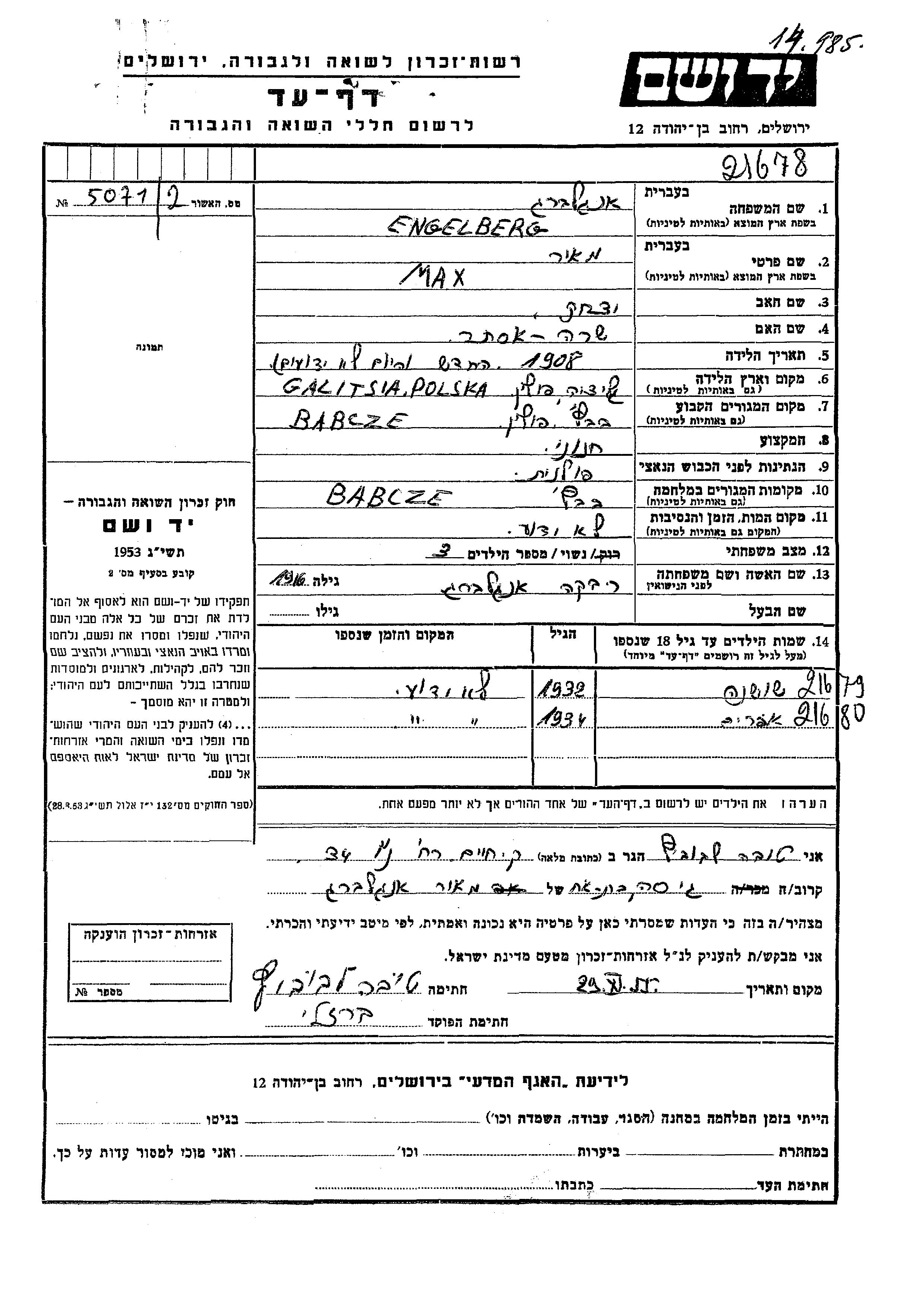 Engelberg Efraim 1934 Babcze, Polen Gedenkblatt