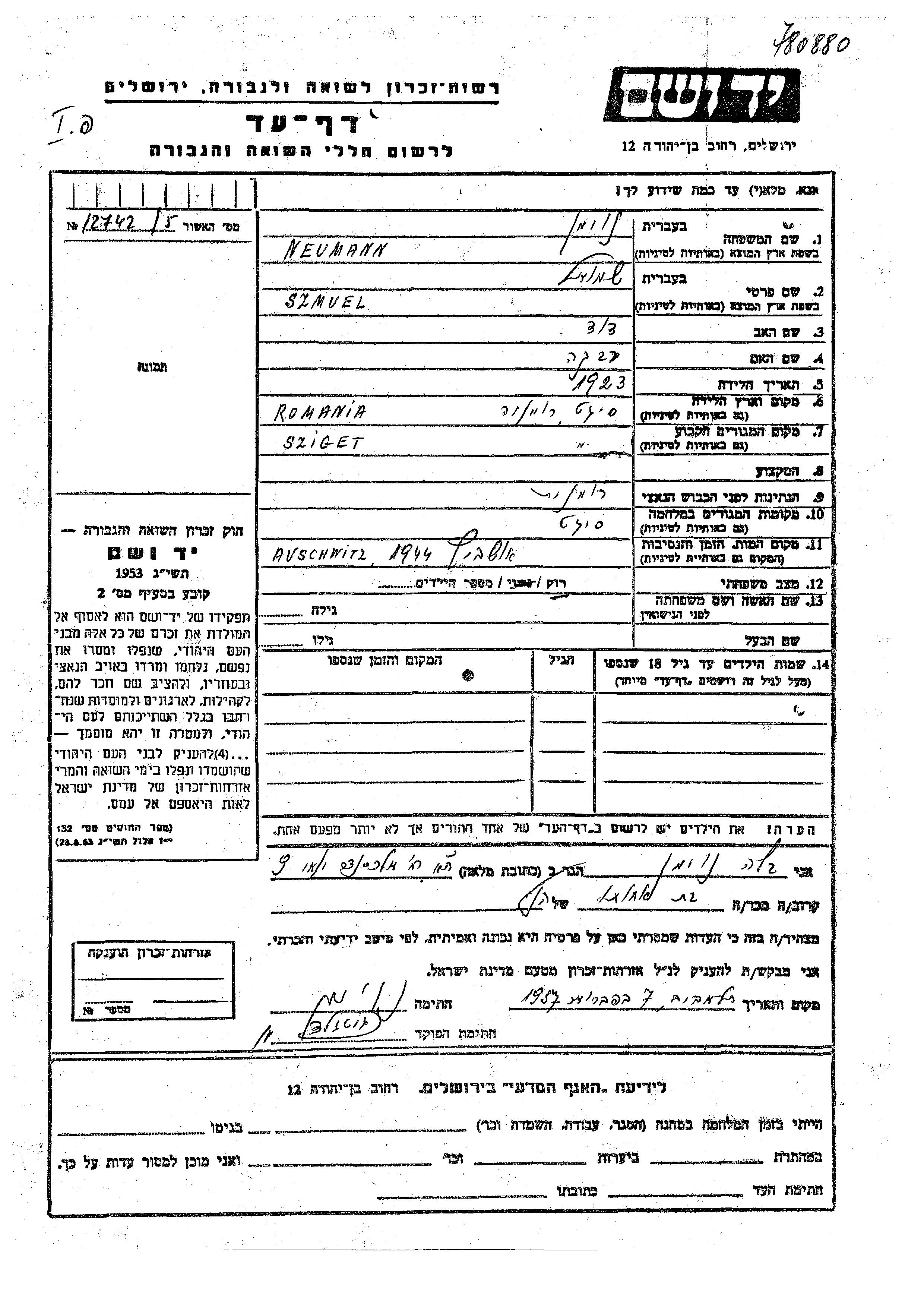 Neumann Szmuel 1923 Sziget, Rumänien Gedenkblatt