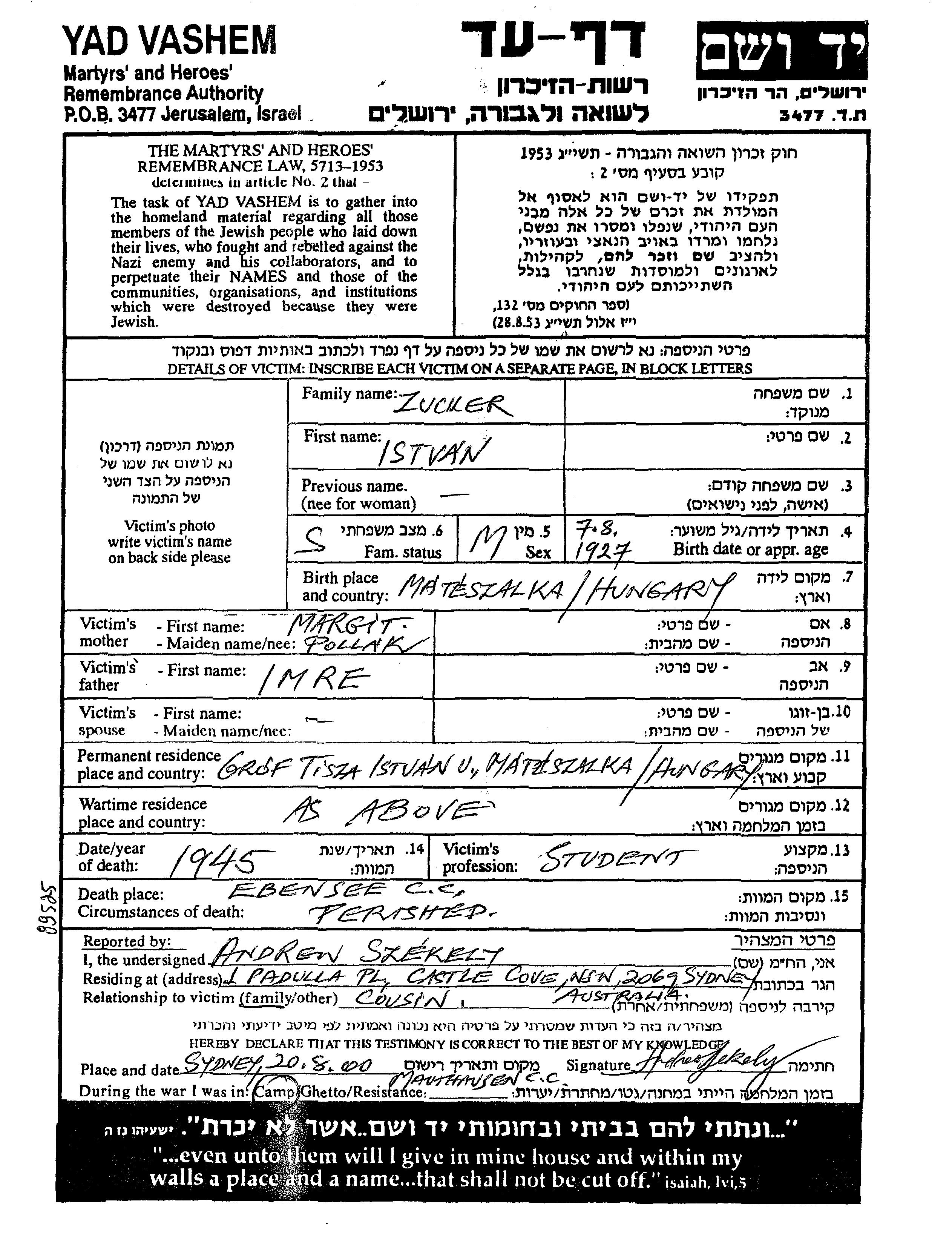 Istvan Zucker wurde im Jahr 1927 in Mateszalka, Ungarn geboren. Er war Student. Vor dem Zweiten Weltkrieg lebte er in Mateszalka, Ungarn.