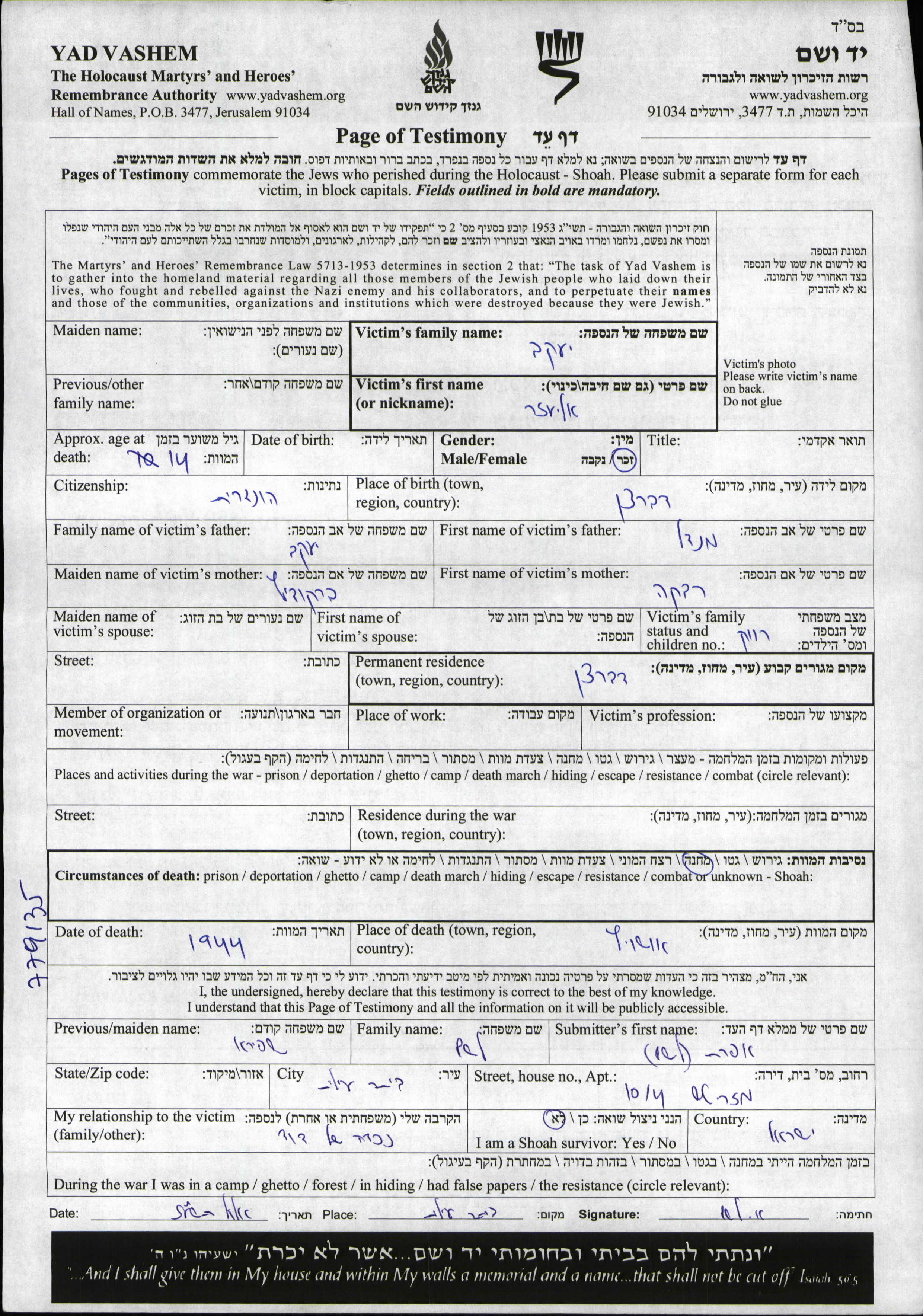 Eliezer wurde in der Schoah ermordet. Todesort: Auschwitz, Polen im Jahr 1944.