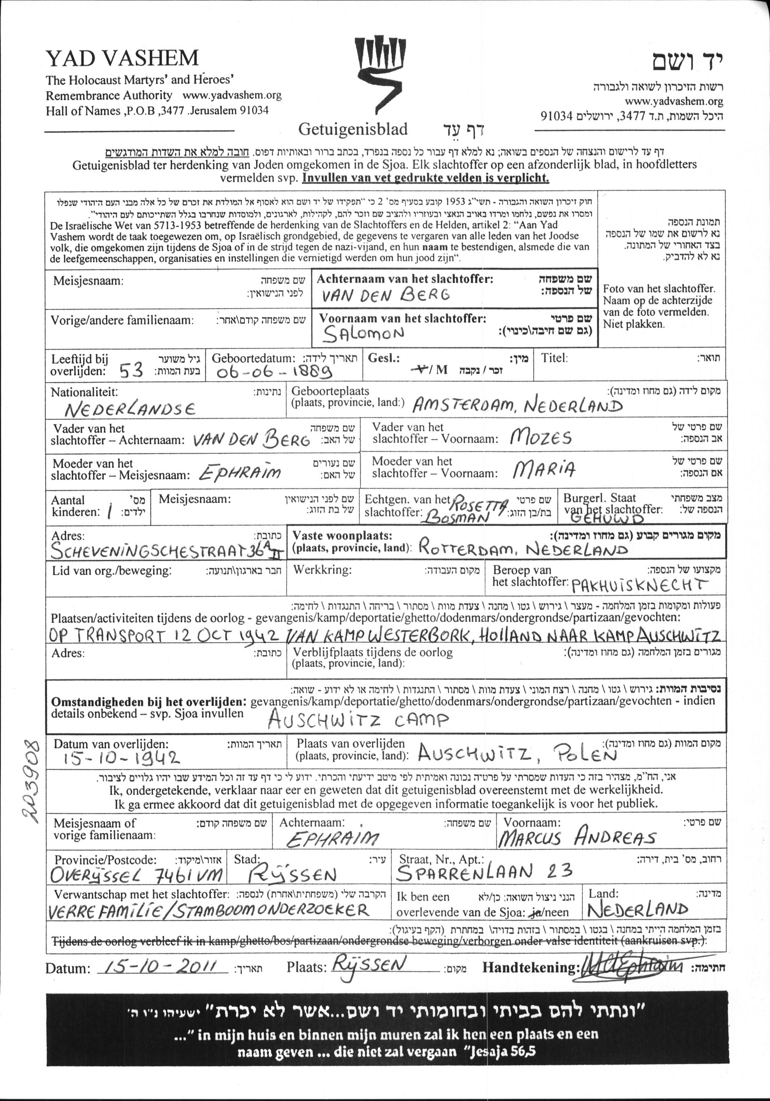Berg van den Salomon 1889 Amsterdam, Niederlande Liste von ermordeten Juden aus Holland