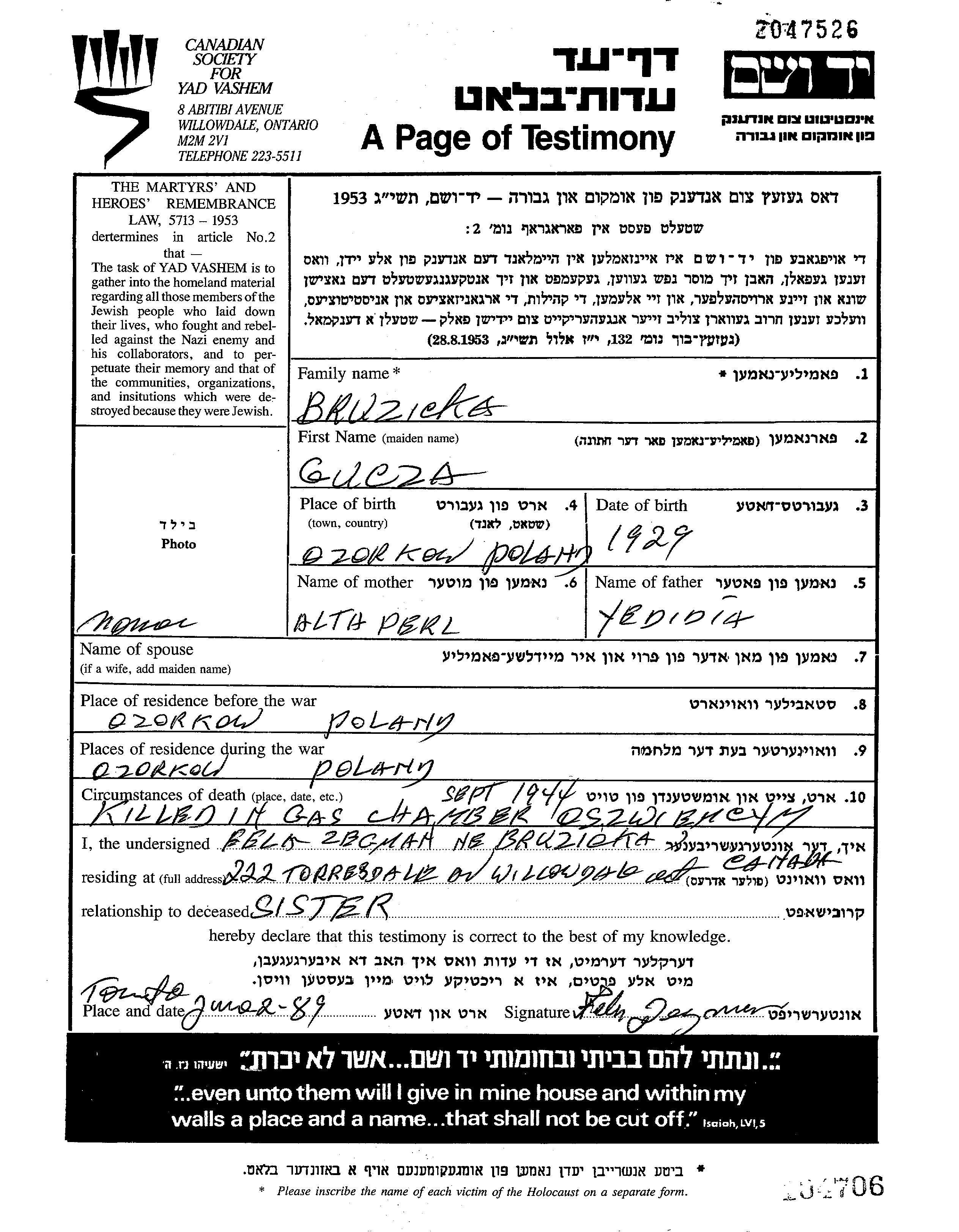 Gitl Bruzitzki wurde im Jahr 1925 in Ozorkow, Polen geboren. Vor dem Zweiten Weltkrieg lebte sie in Ozorkow, Polen.