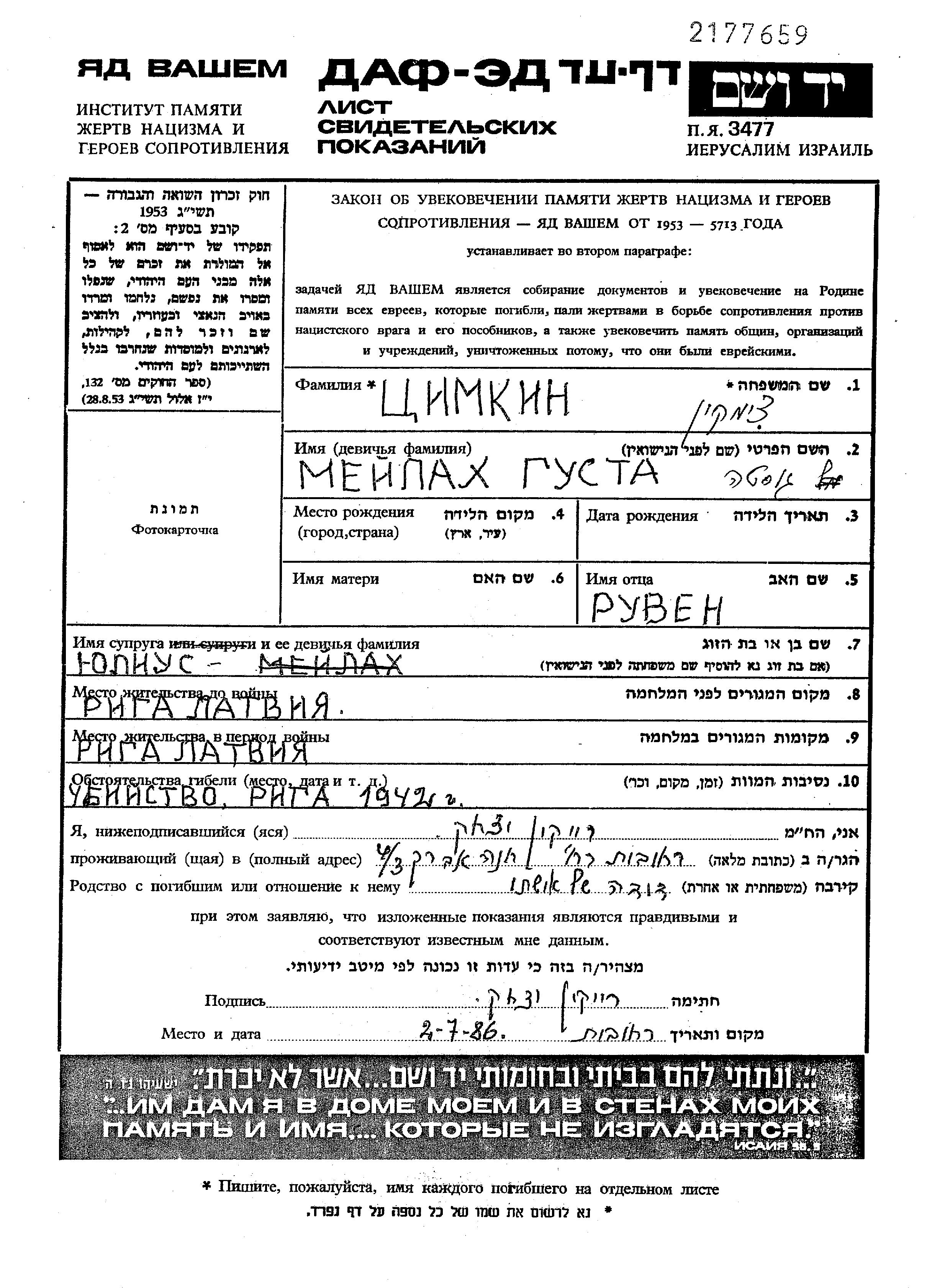 Tzimkin Gusta Riga, Lettland Gedenkblatt