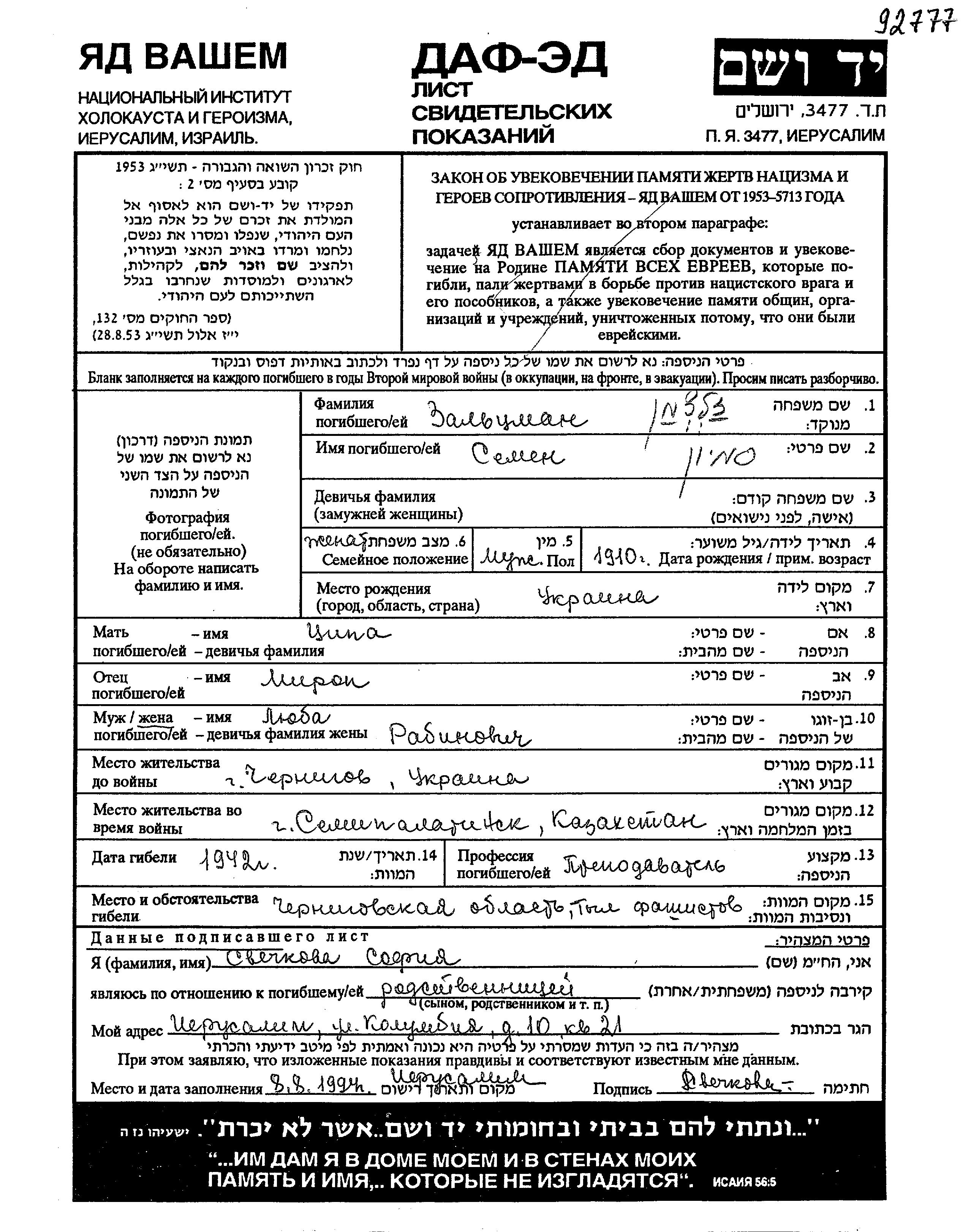 Zaltzman Semen 1910 Chernigov, Ukraine (UdSSR) Verfolgtenliste