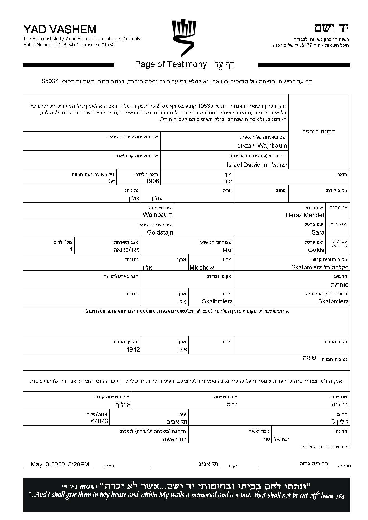 Wajnbaum Israel Dawid 1906 Skalbmierz, Polen Gedenkblatt (digital)