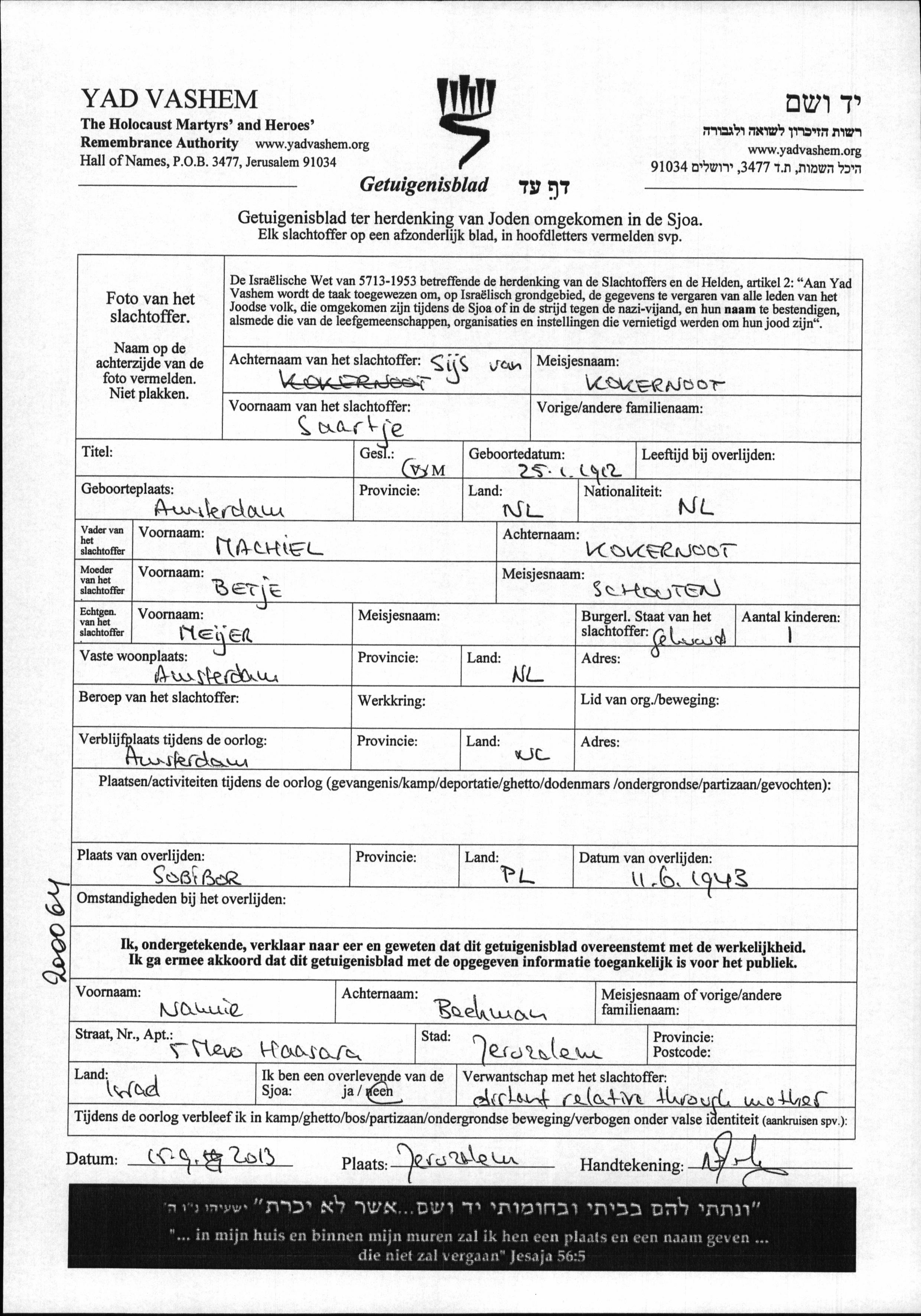 Saartje Sijs van, geb. Kokernoot wurde im Jahr 1912 in Amsterdam, Niederlande geboren. Vor dem Zweiten Weltkrieg lebte sie in Amsterdam, Niederlande.