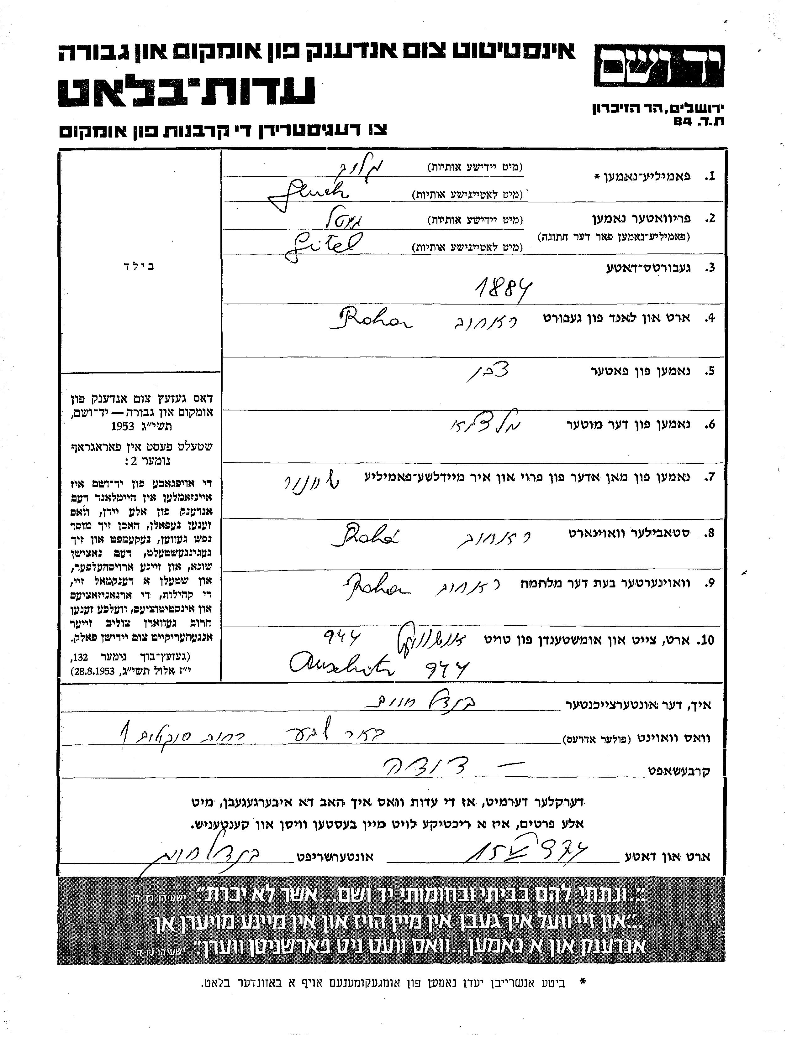 Gitel Schöner, geb. Gluck wurde im Jahr 1884 in Raho, Tschechoslowakei geboren. Sie war die Tochter von Tzvi und Malka. Vor dem Zweiten Weltkrieg lebte sie in Raho, Tschechoslowakei. Während des Krieges war sie in Raho, Tschechoslowakei.